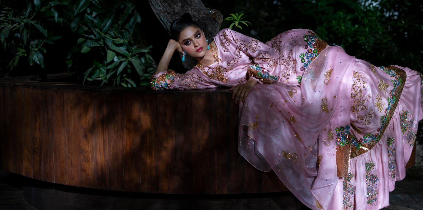 Elevate traditional gatherings with a silhouette that merges heritage and modern glamour. A soft makeup look and delicate accessories enhance the couture detailing.