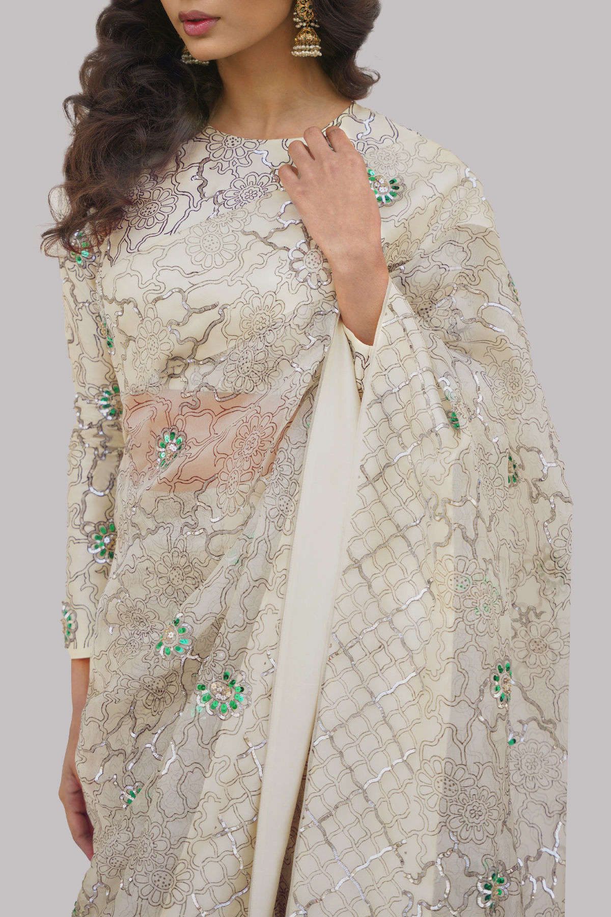 The Afterglow Organza sari is adorned with intricate block prints and lightly embellished with luminous French sequins for a soft, radiant finish. Paired with a matching raw silk blouse featuring coordinated block prints and delicate embellishments.