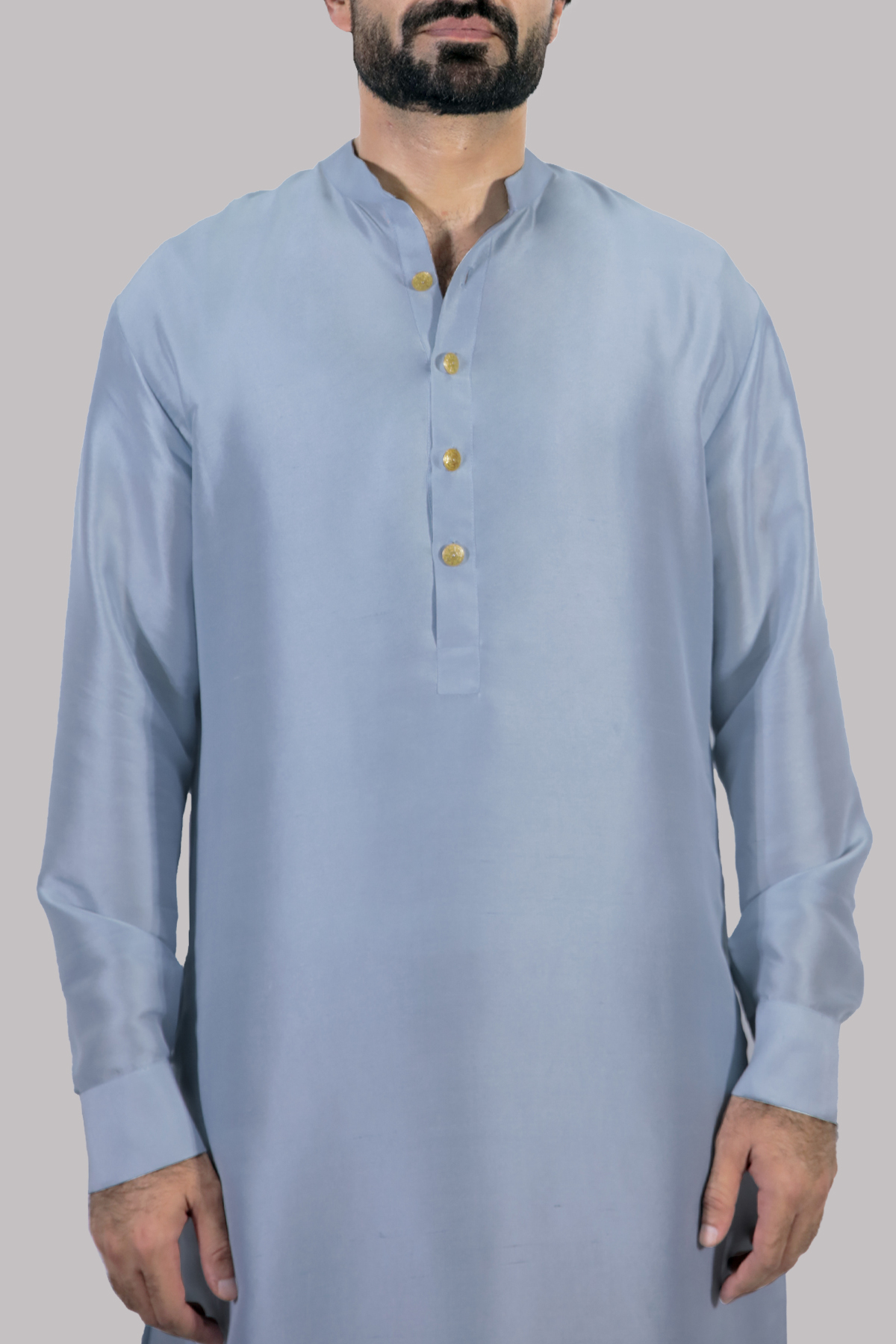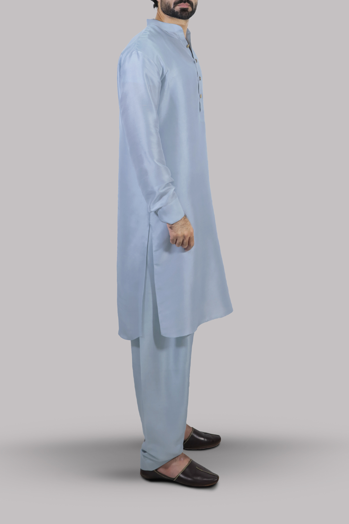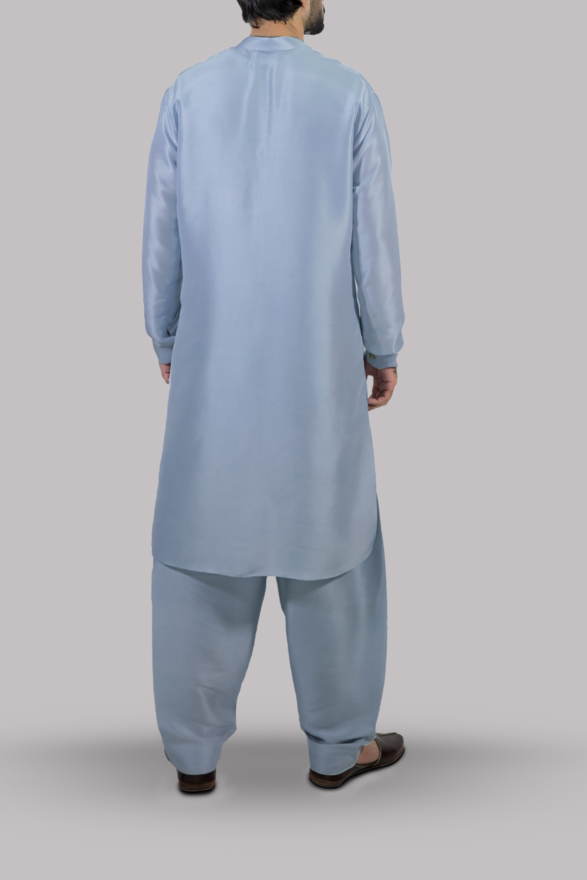 Aquamarine oversized raw silk collared shirt adorned with French buttons. It’s impeccably tailored with matching raw silk shalwar pants.