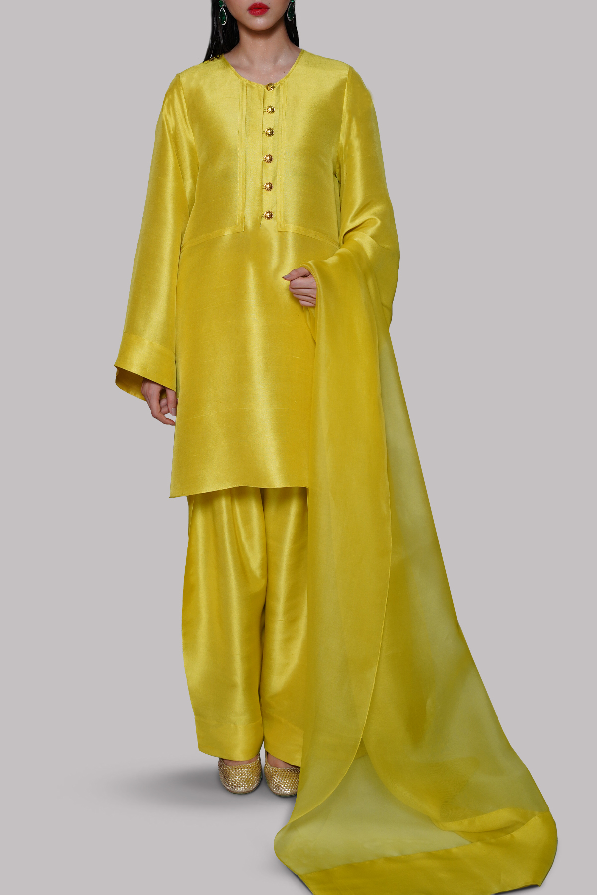 Radiating warmth and sophistication, the Aurora Yellow raw silk tunic features fine stitch detailing along the neckline and delicate French buttons for a touch of understated elegance. Paired with a matching shalwar and a sheer organza dupatta, this ensemble exudes effortless charm.