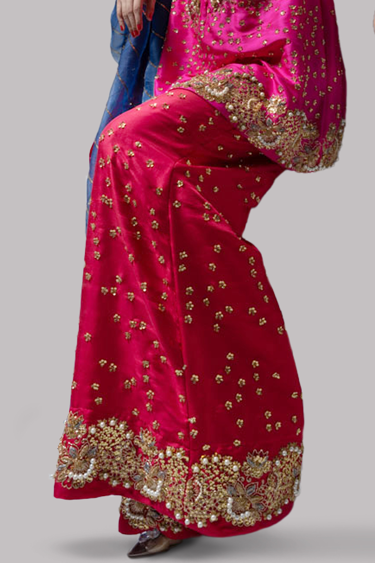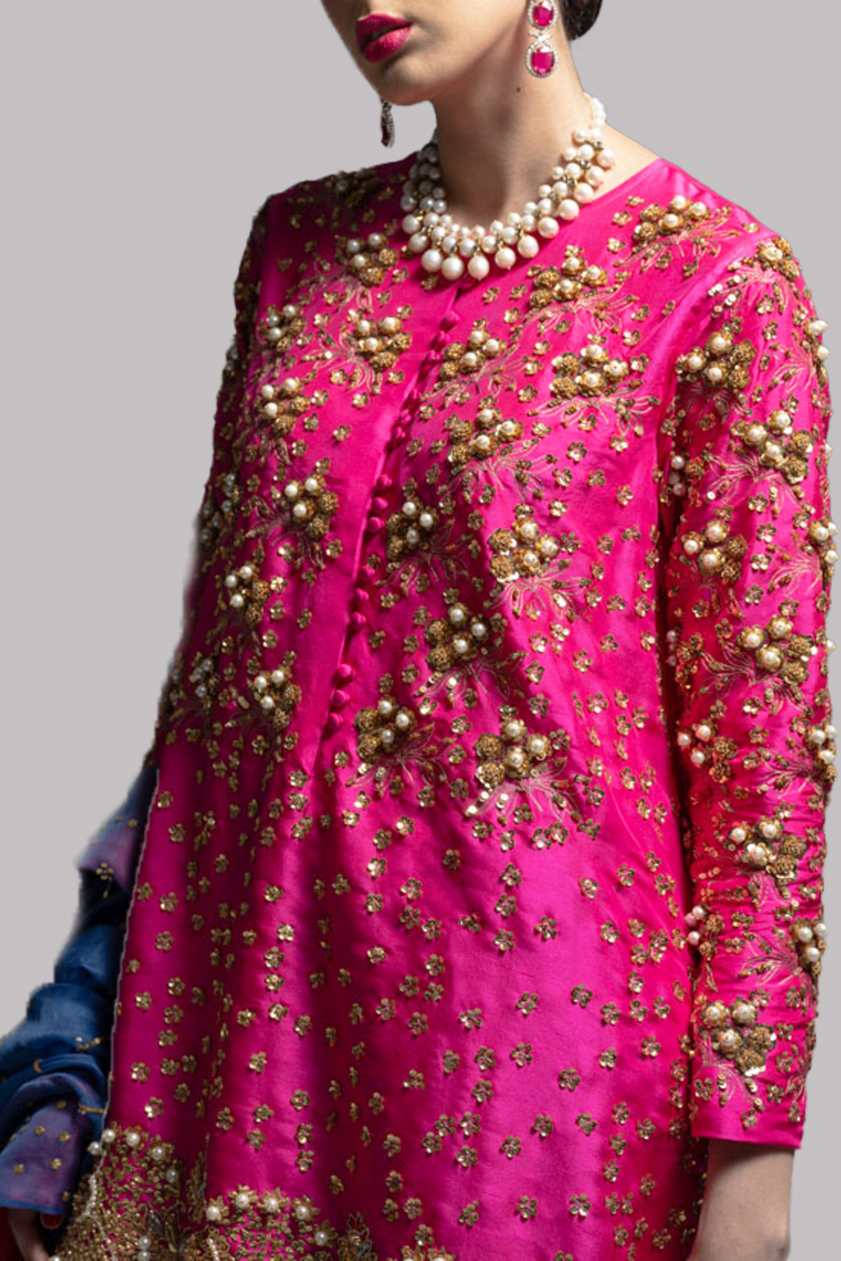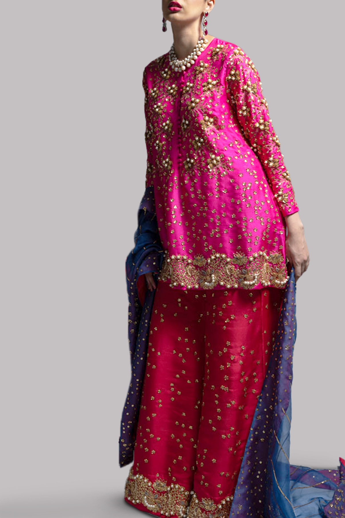 Rich Beetroot Purple meets vibrant Tango Red and a Blueprint organza dupatta, each adorned with refined embellishments for a modern yet regal statement look.
