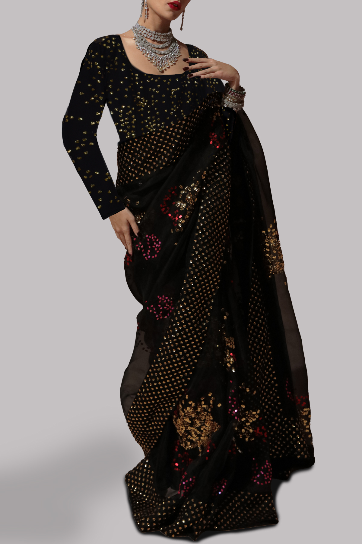 Black hand embellished organza sari with fresh water pearls, glittering sequins and gold beads. The sari has stitched pleats for ease of wearing and an adjustable waist to ensure the most flattering fit. Silk petticoat included. The feathers blouse is only used for styling purpose, it is not included. A plain raw silk sleeveless blouse is included.