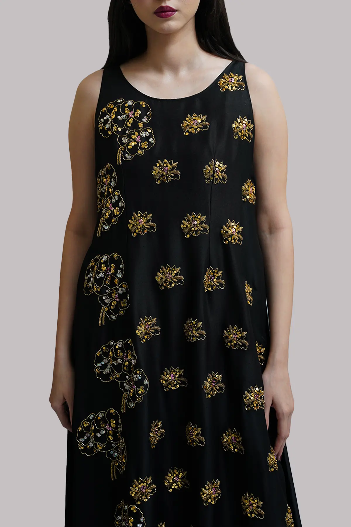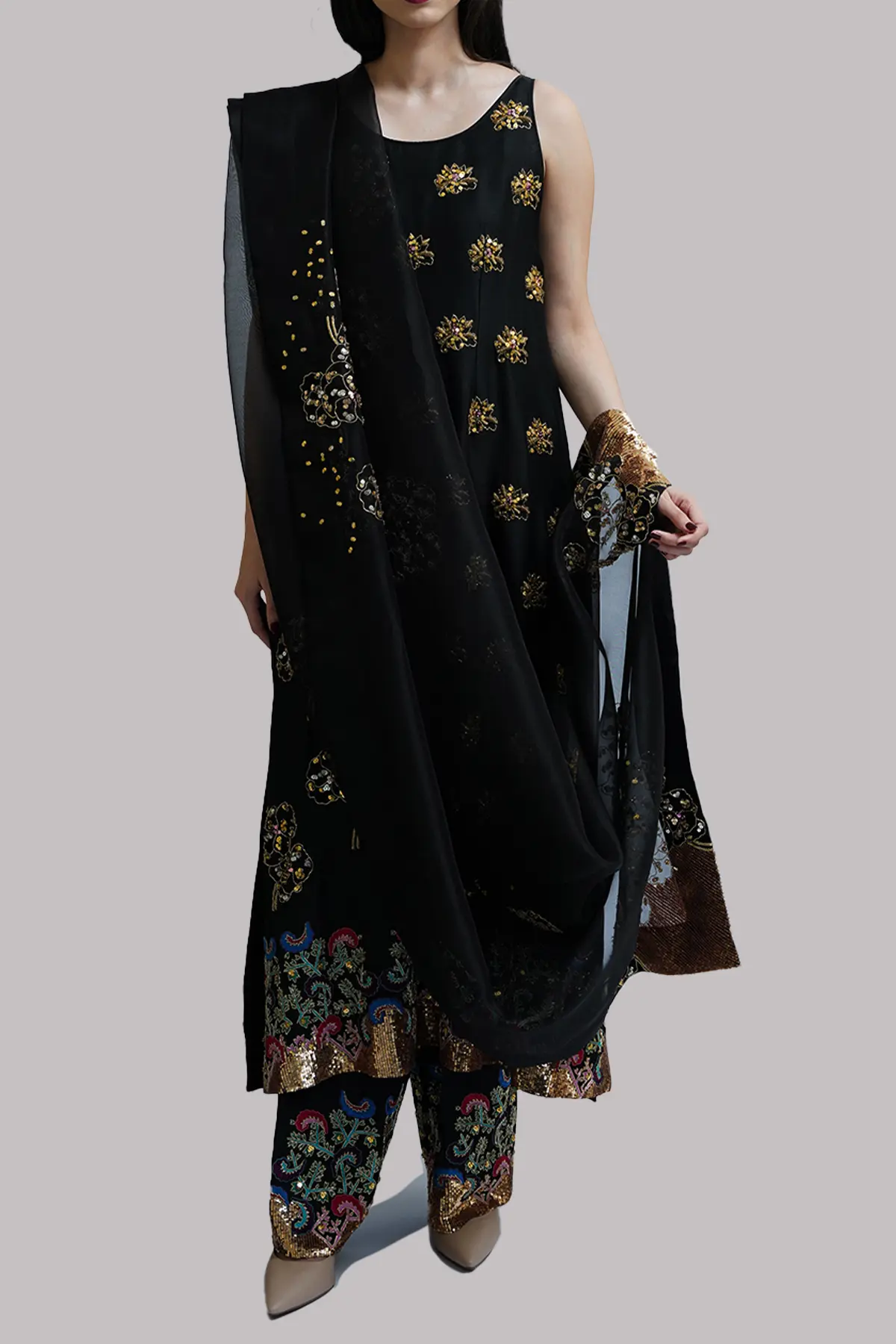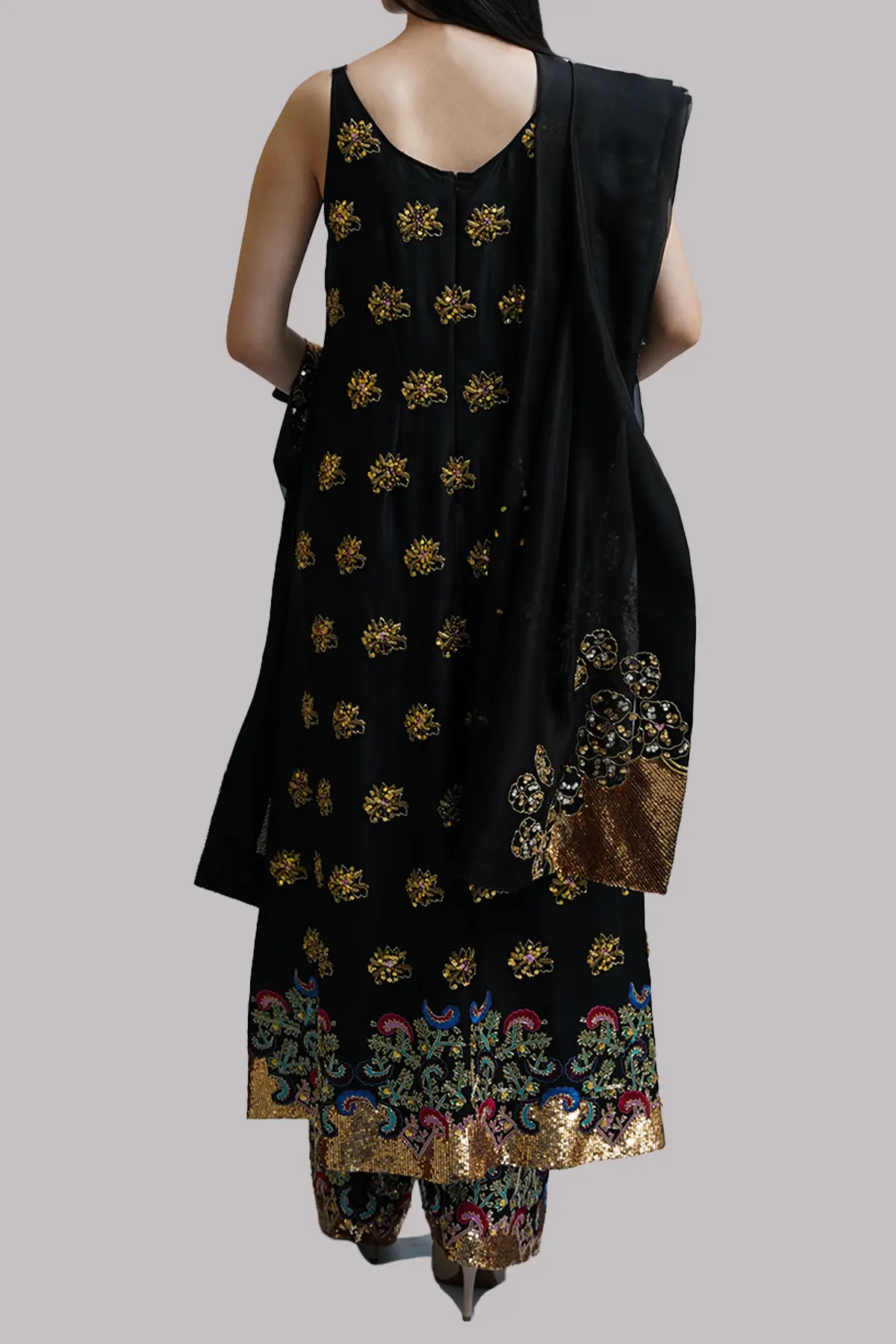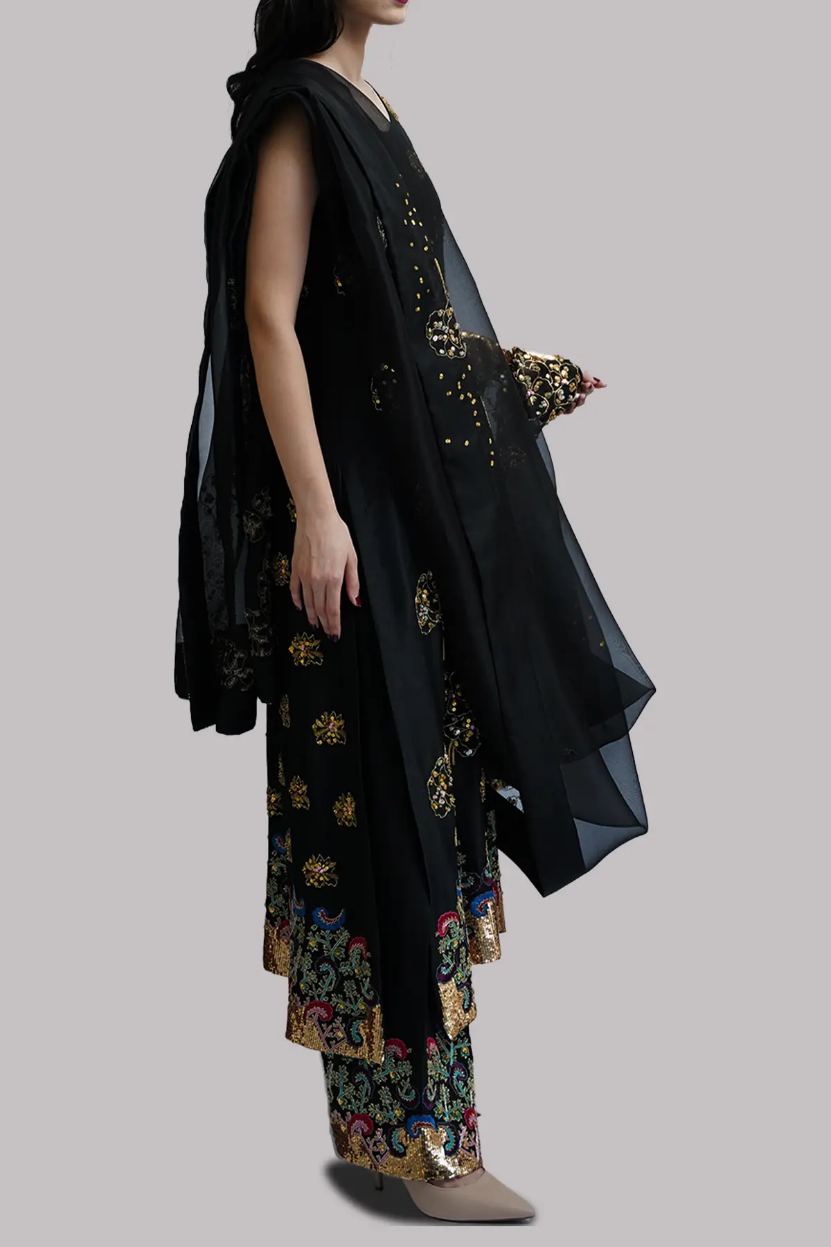 Black raw silk tunic adorned with delicate embellishments. Paired with a matching embellished shalwar and a gracefully detailed organza dupatta.