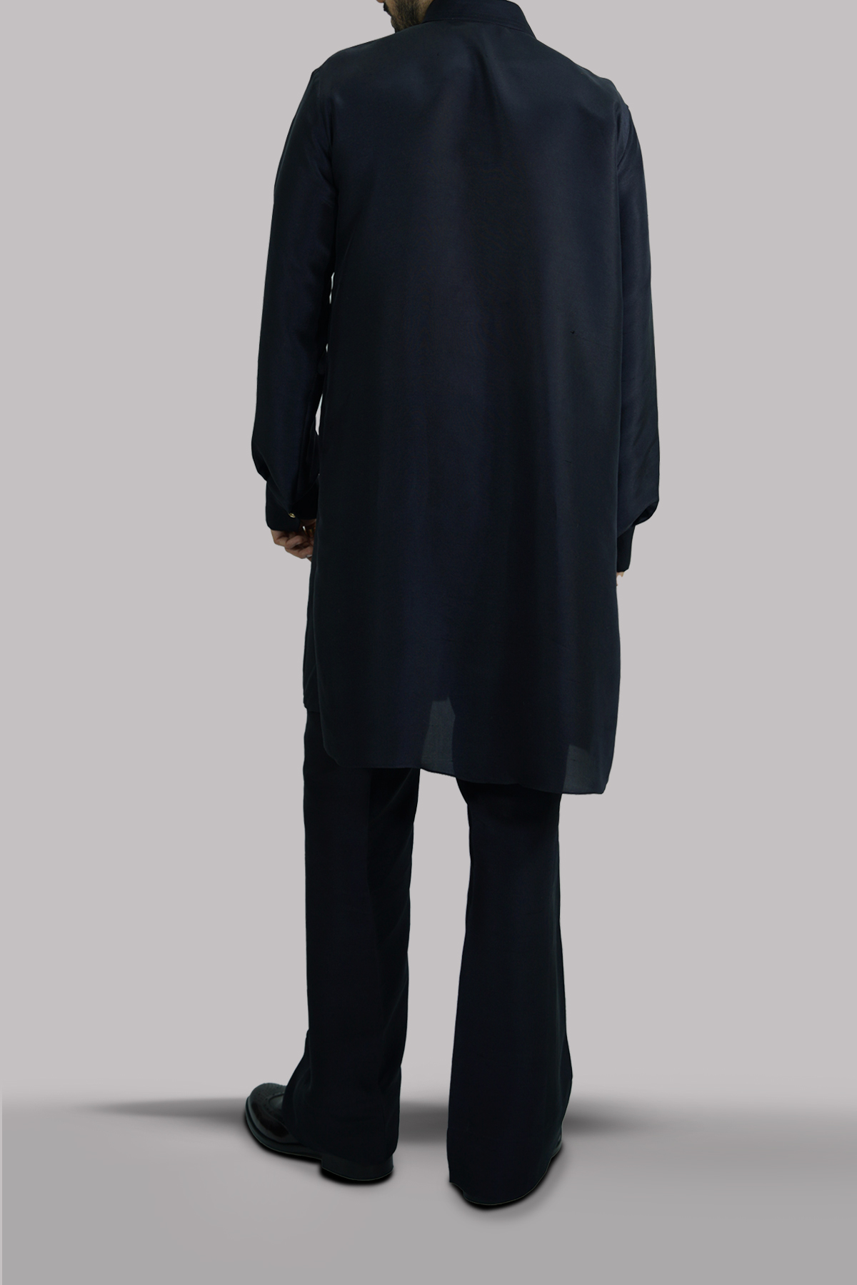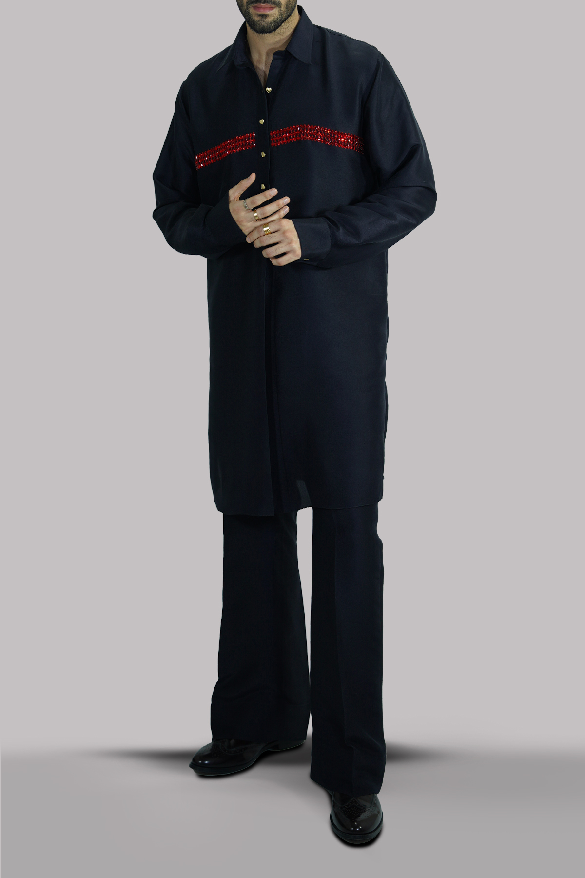 Oversized raw silk shirt embellished with red coloured stones appealingly shiny and smooth, elevated with perfect cut and extravagant details. Paired with impeccably tailored trousers made from silk feels so luxurious.