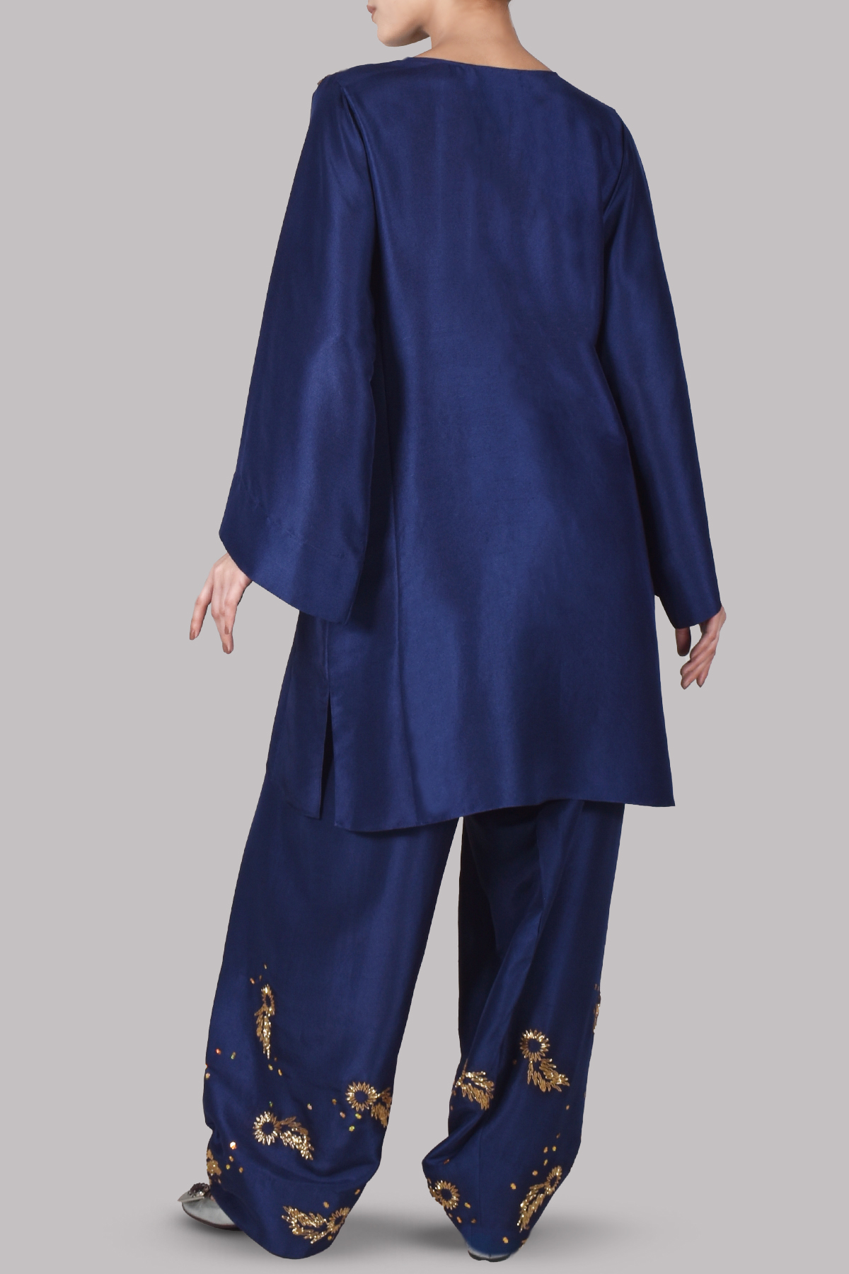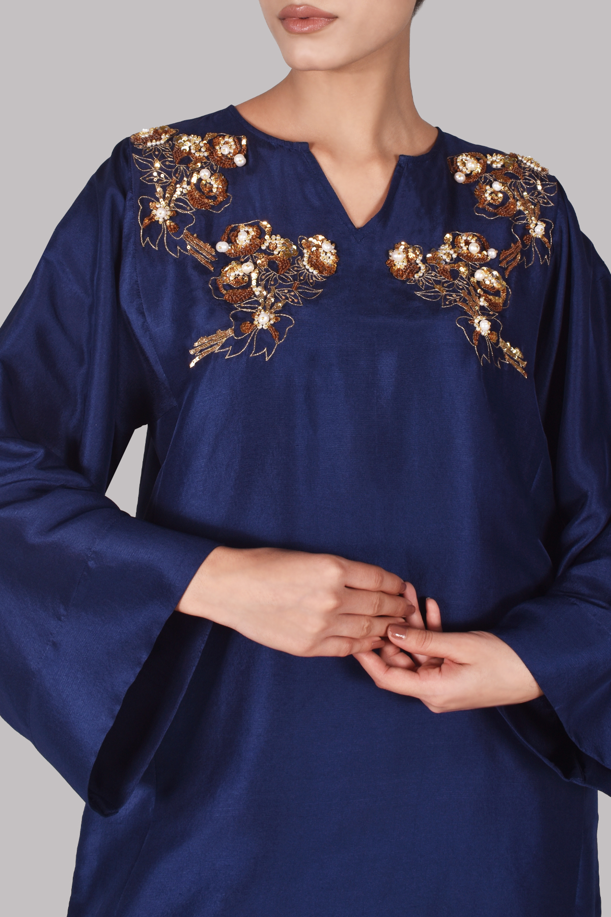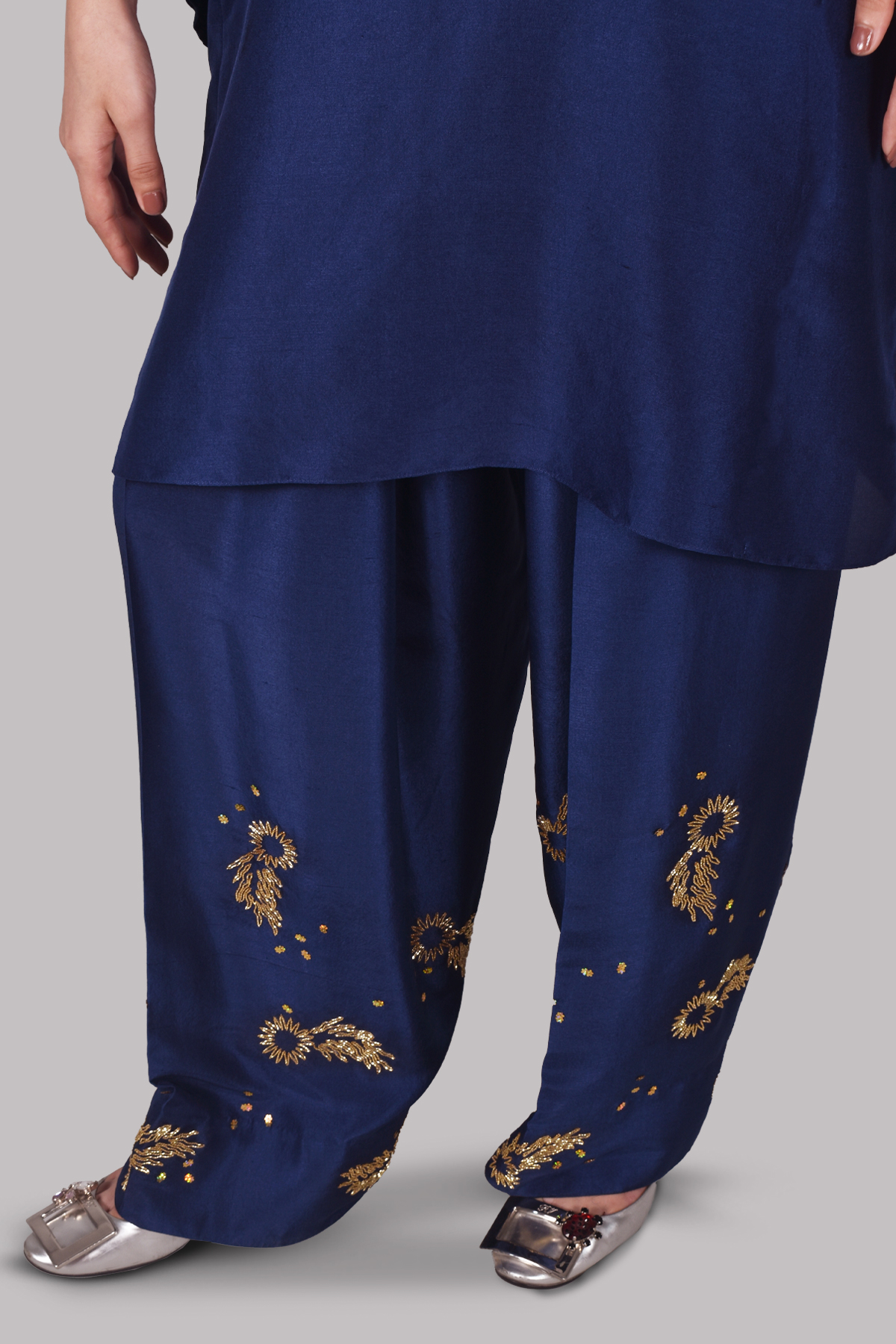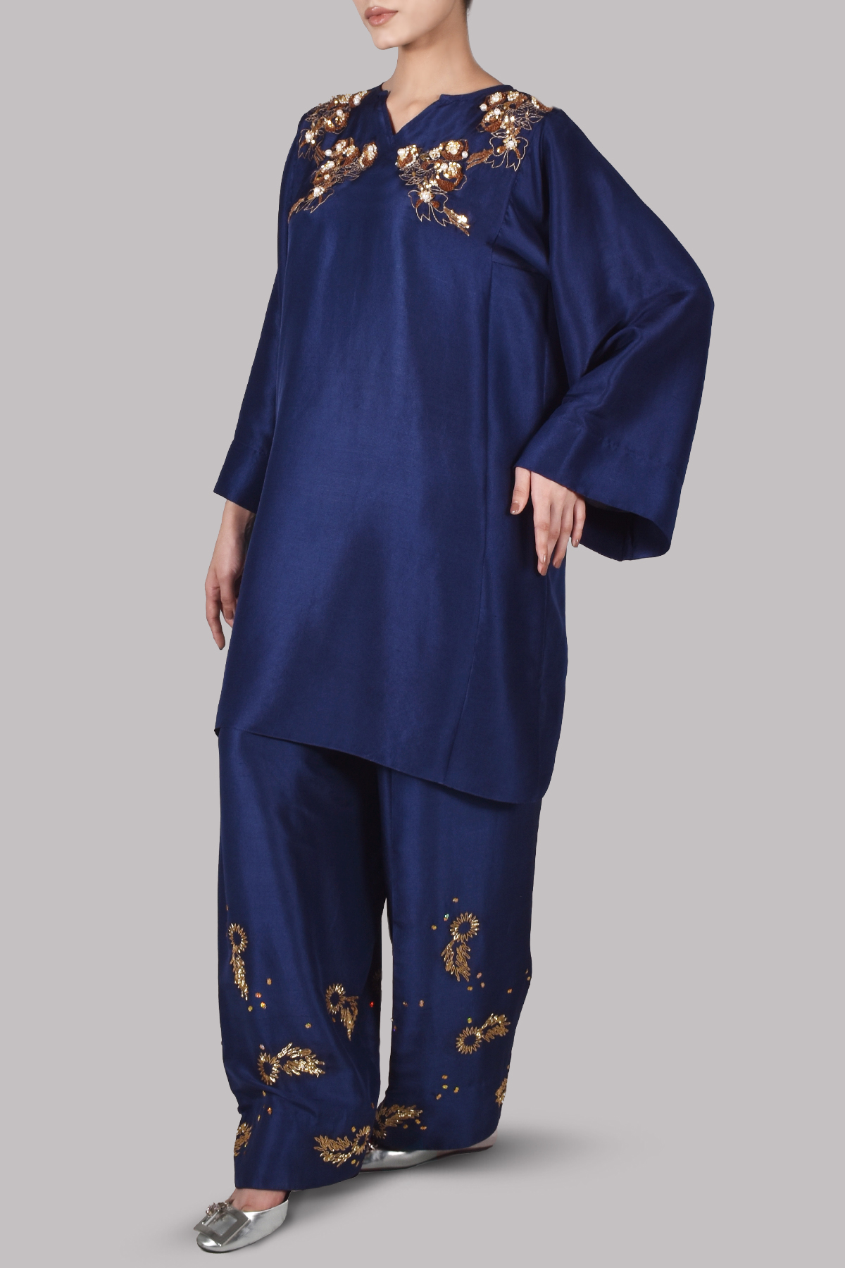 In a deep, captivating shade of Black Iris, this raw silk tunic is designed with a graceful “V” neckline adorned with intricate embellishments that bring subtle brilliance to its refined silhouette. The tunic is paired with a matching raw silk shalwar, creating a timeless look that is both elegant and versatile.