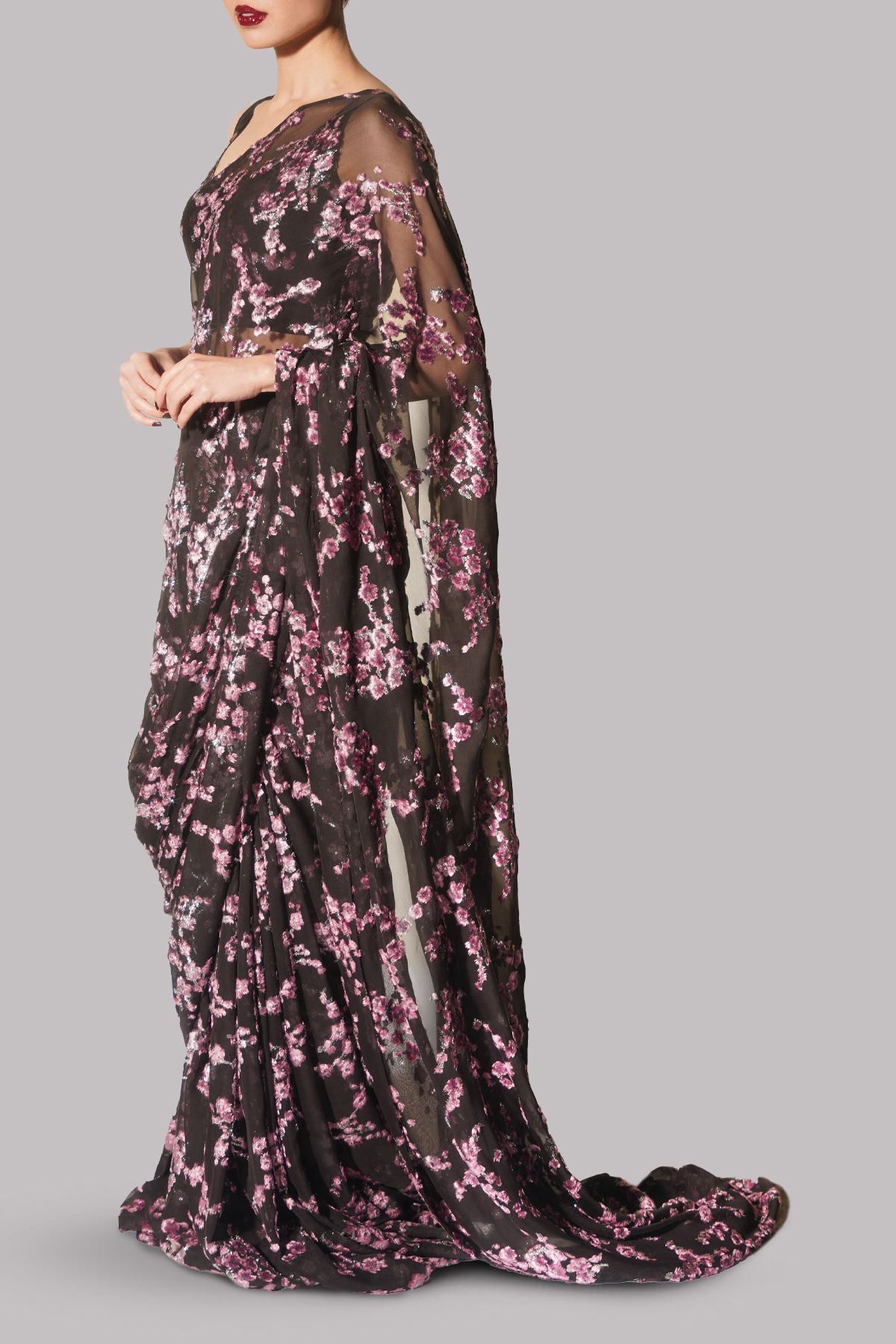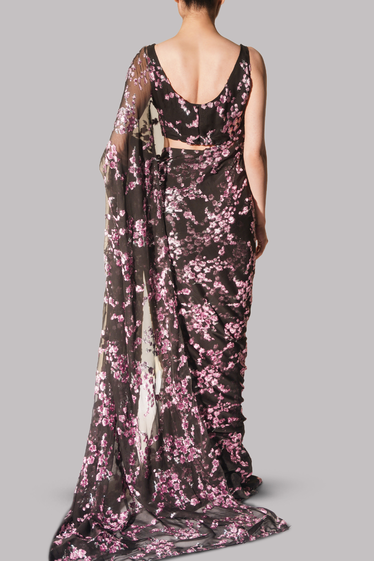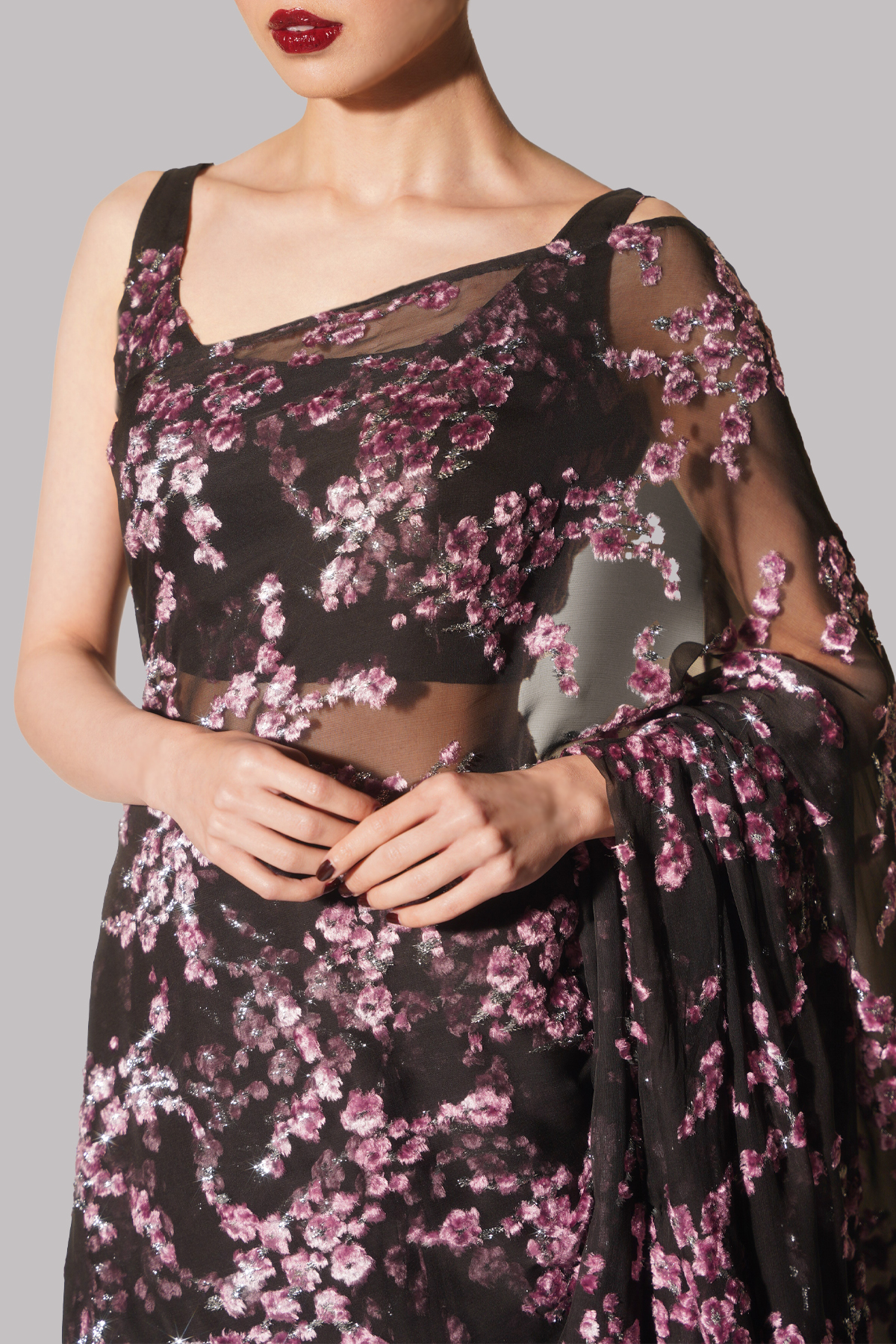 A sheer black Italian chiffon sari adorned with delicate pink floral motifs, offering a fluid, graceful drape. Paired with a matching blouse, it’s an elegant statement of modern romance and timeless sophistication.