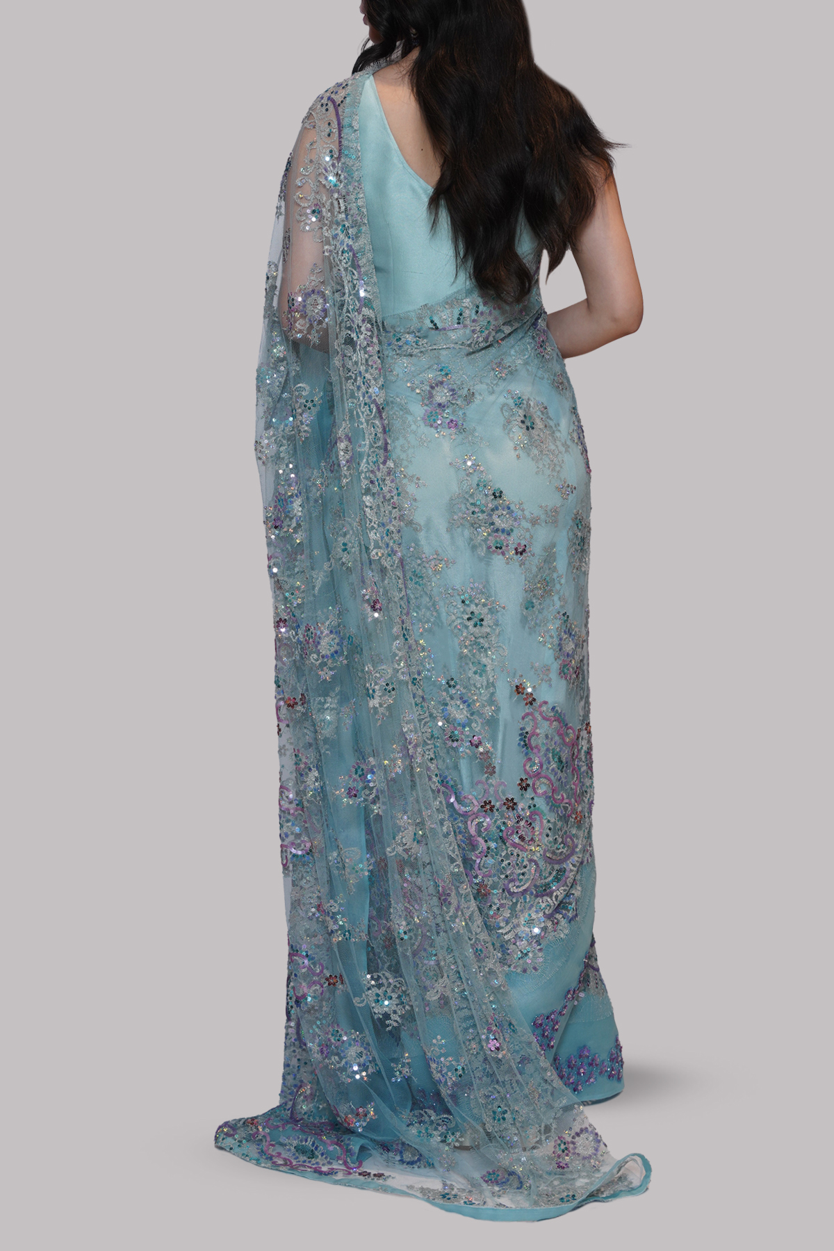 Delicate and refined, this Cabana Blue Chantilly Lace sari is adorned with intricate embellishments that add a soft shimmer to its ethereal drape. Paired with a matching blouse featuring an elegantly embellished neckline, the ensemble exudes timeless grace and modern sophistication.