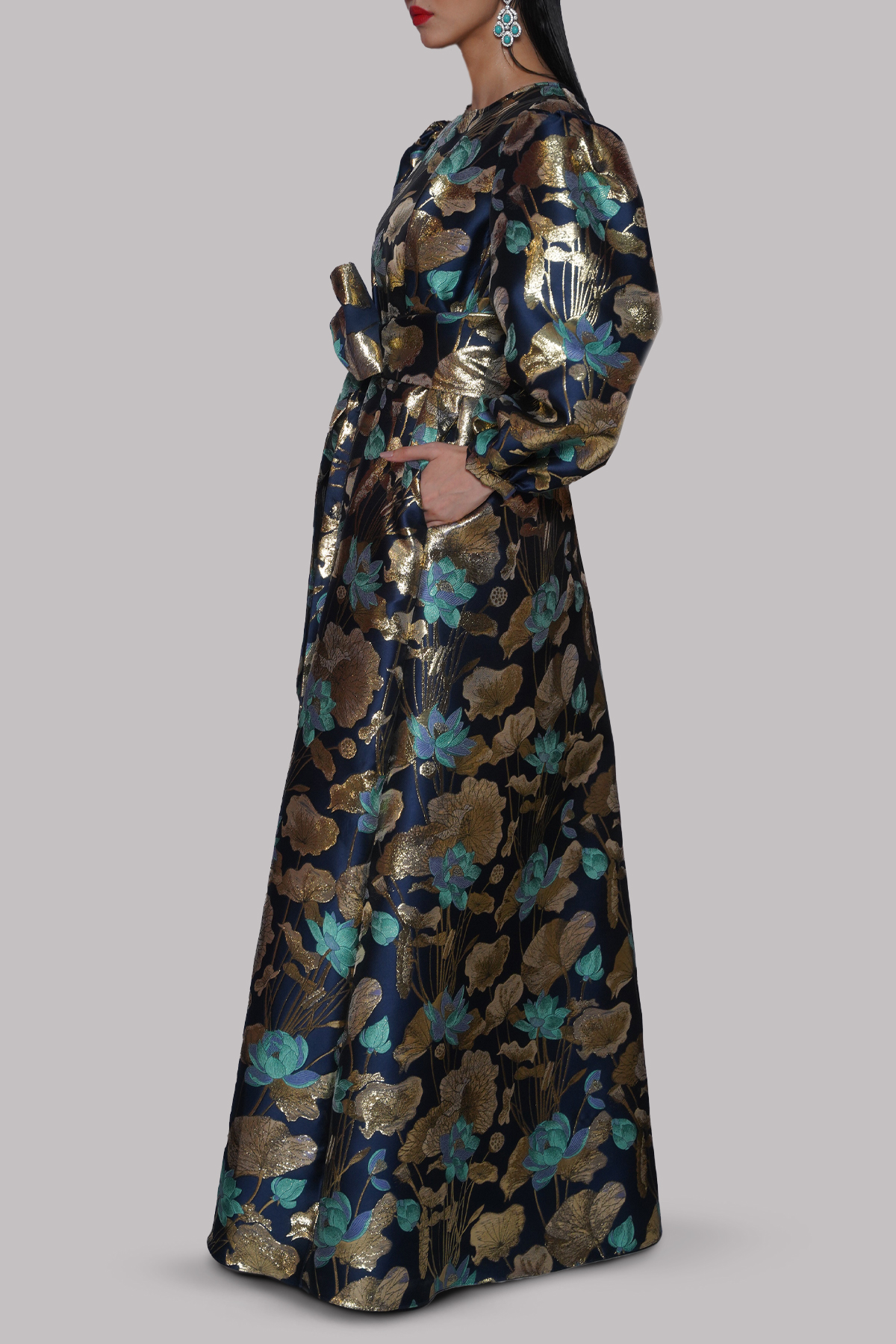 Crafted from luxurious Italian brocade, this Blue maxi features a graceful crew neckline and voluminous puffy sleeves, exuding timeless elegance with its bow belt. The fabric’s intricate gold and blue rose pattern adds depth, texture, and a regal charm to the silhouette.