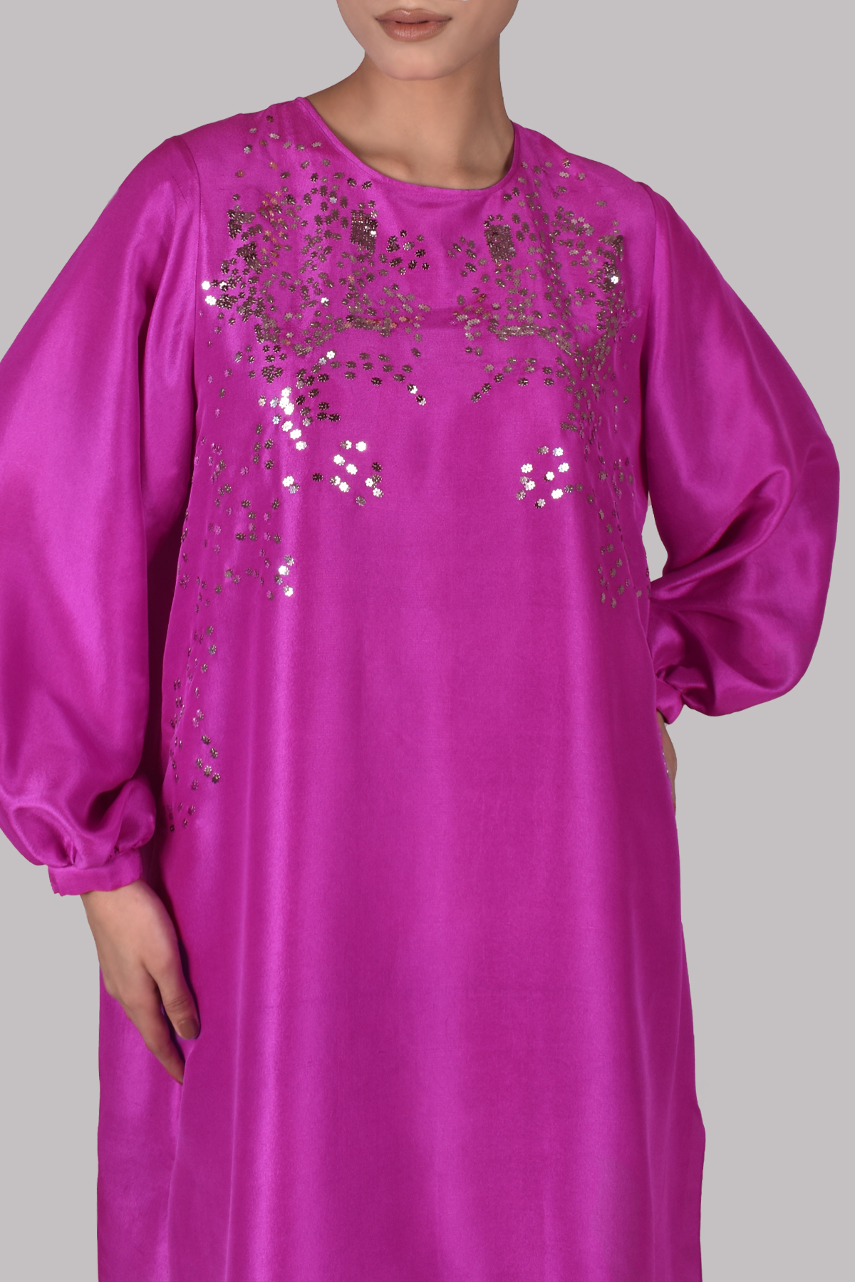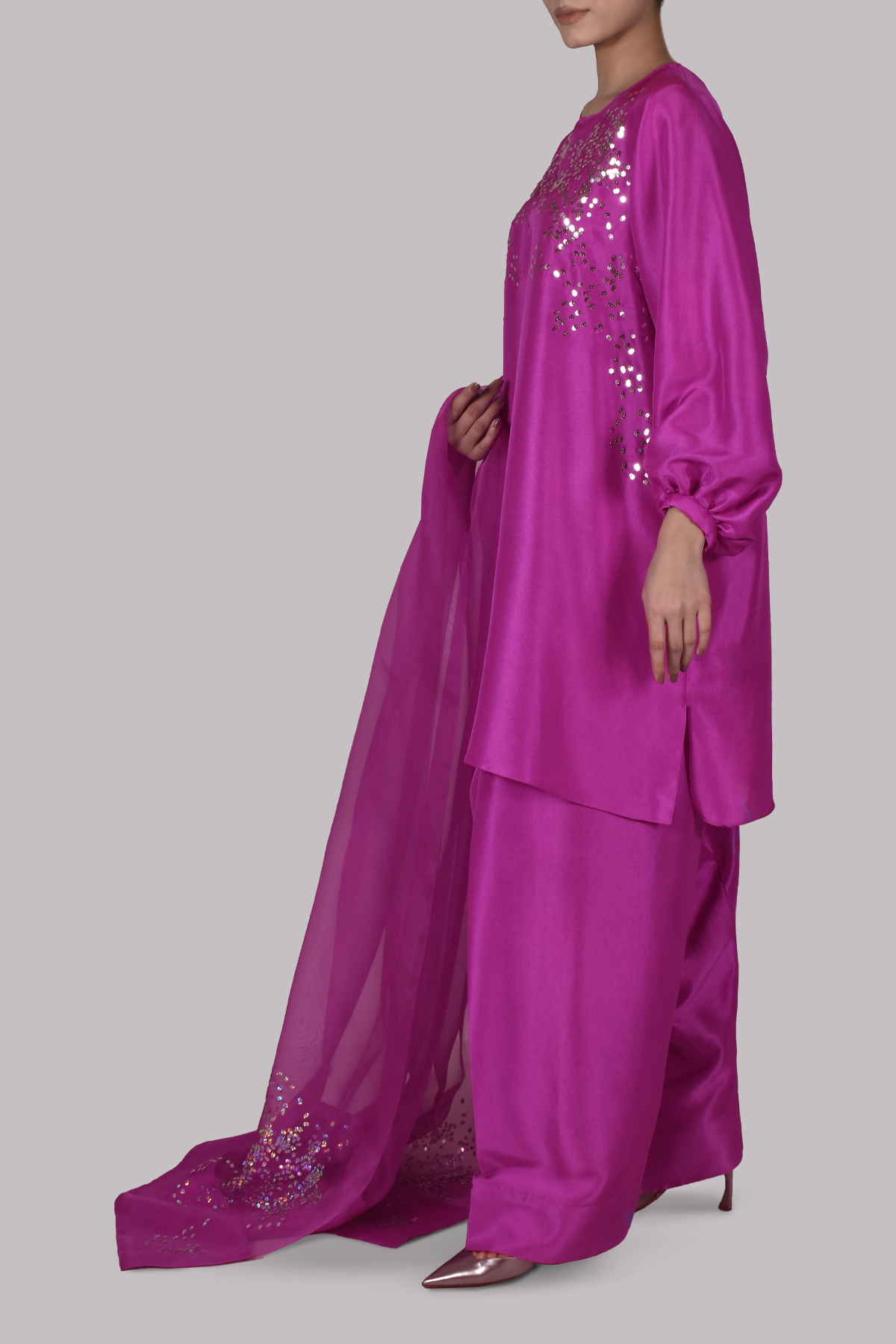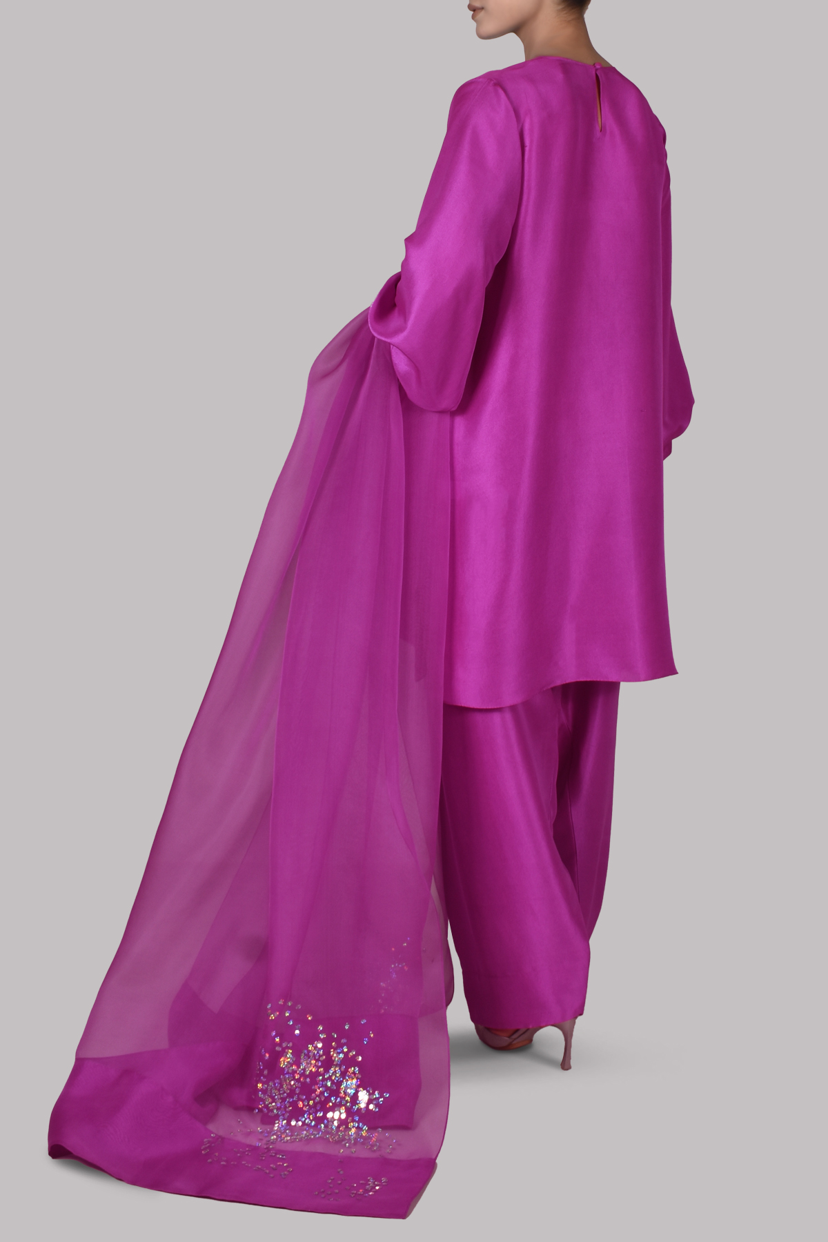 Crafted in lustrous raw silk, this tunic captures the quiet opulence of Byzantium. The neckline is delicately adorned with hand-applied French and Italian sequins, catching the light with subtle brilliance. Paired with a matching raw silk shalwar, the silhouette is both timeless and refined. Completing the look, a sheer organza dupatta, thoughtfully embellished to mirror the tunic’s details, drapes with effortless grace.