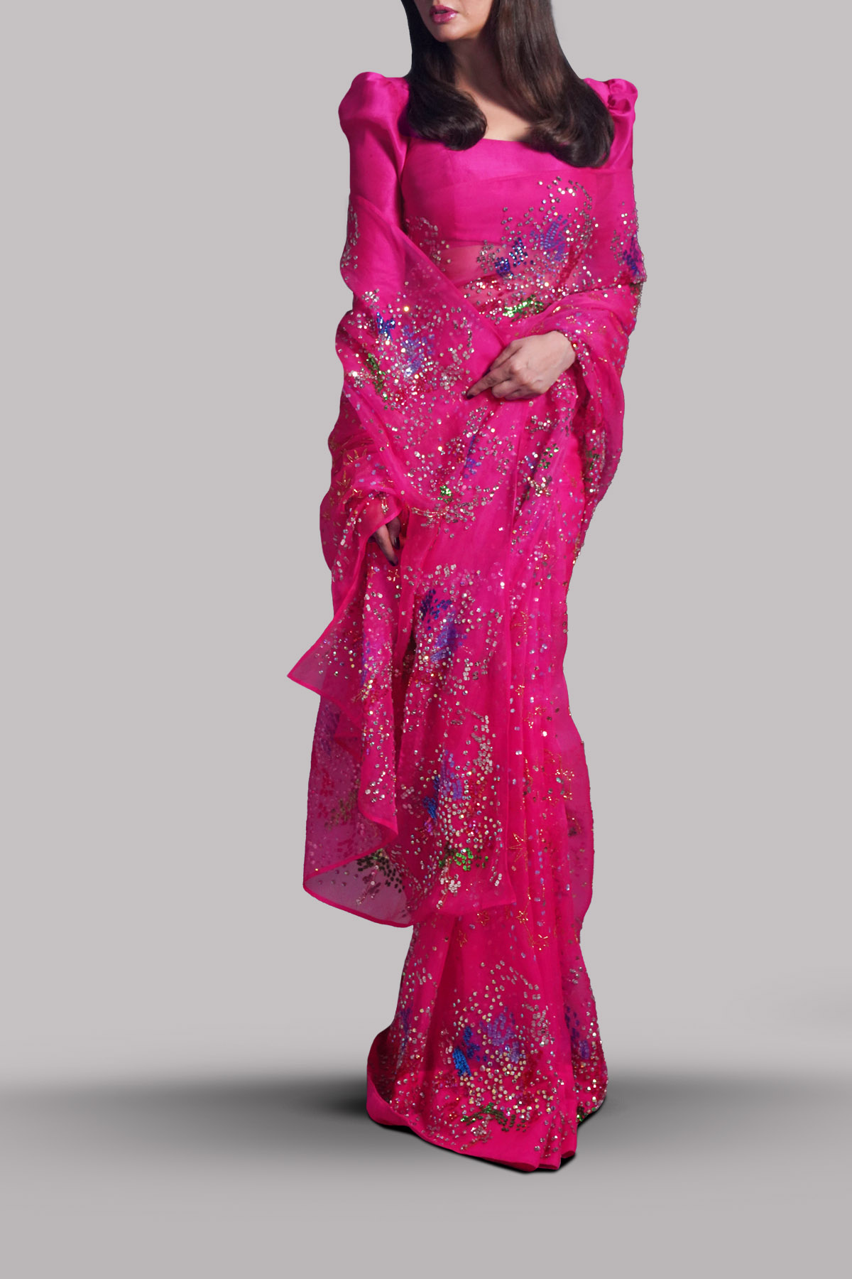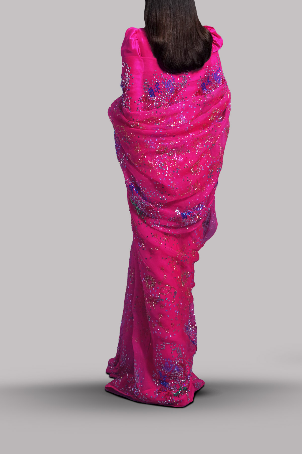 CAMELLIA PINK ORGANZA SARI HAND EMBELLISHED WITH OUR INTRICATE EMBELLISHMENTS OF DAZZLING CRYSTALS AND MULTI COLORED GLISTENING SEQUINS. MATCHING CROPPED BLOUSE HAND EMBELLISHED WITH FRENCH AND ITALIAN GLITTERING SEQUINS. THIS SENSATIONAL SARI IS NO EXCEPTION. THIS IS A STYLISH AND PERFECT THREE PIECE LOOK. THE SARI HAS STITCHED PLEATS FOR EASE OF WEARING. MATCHING STITCHED UNDERSKIRT INCLUDED.