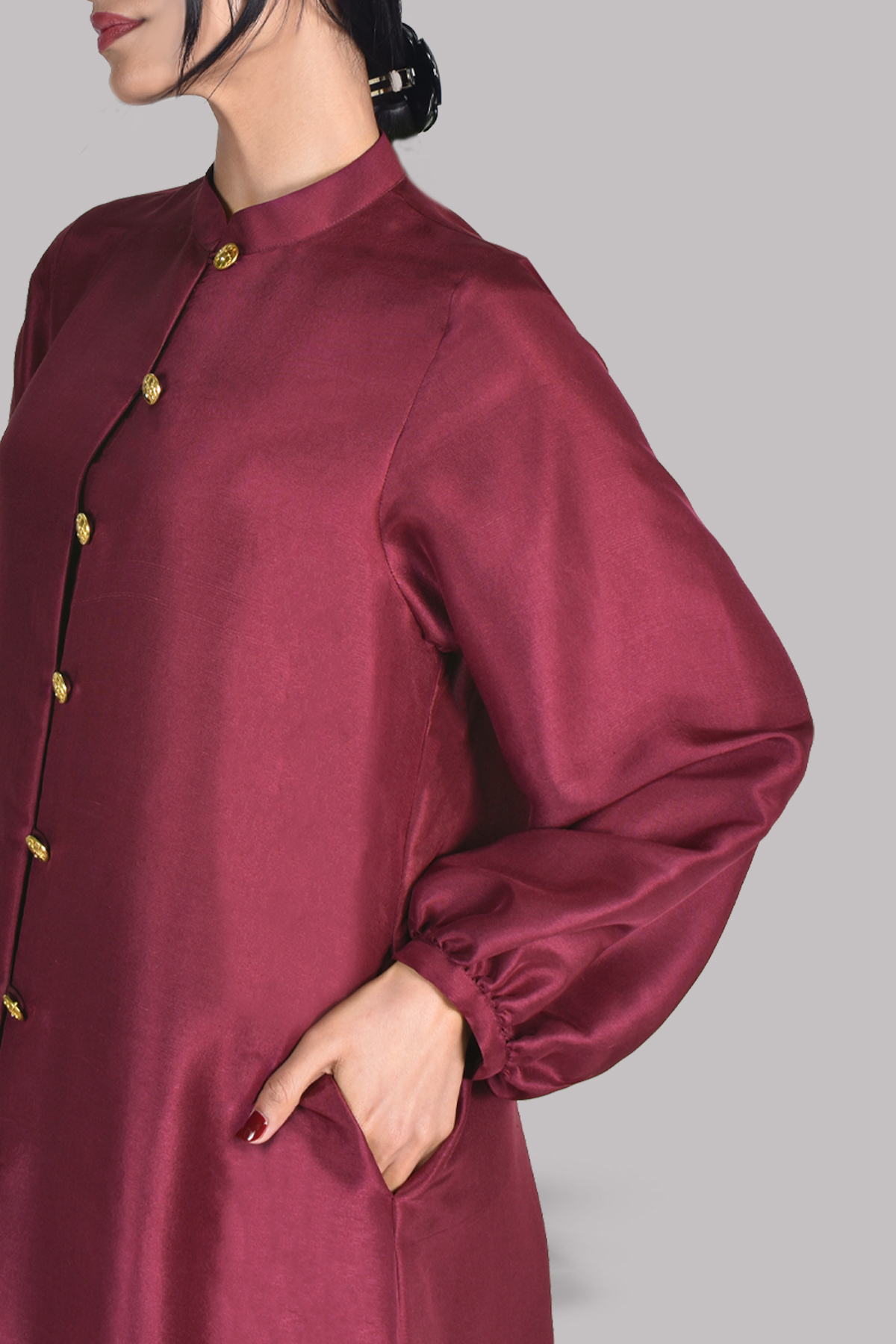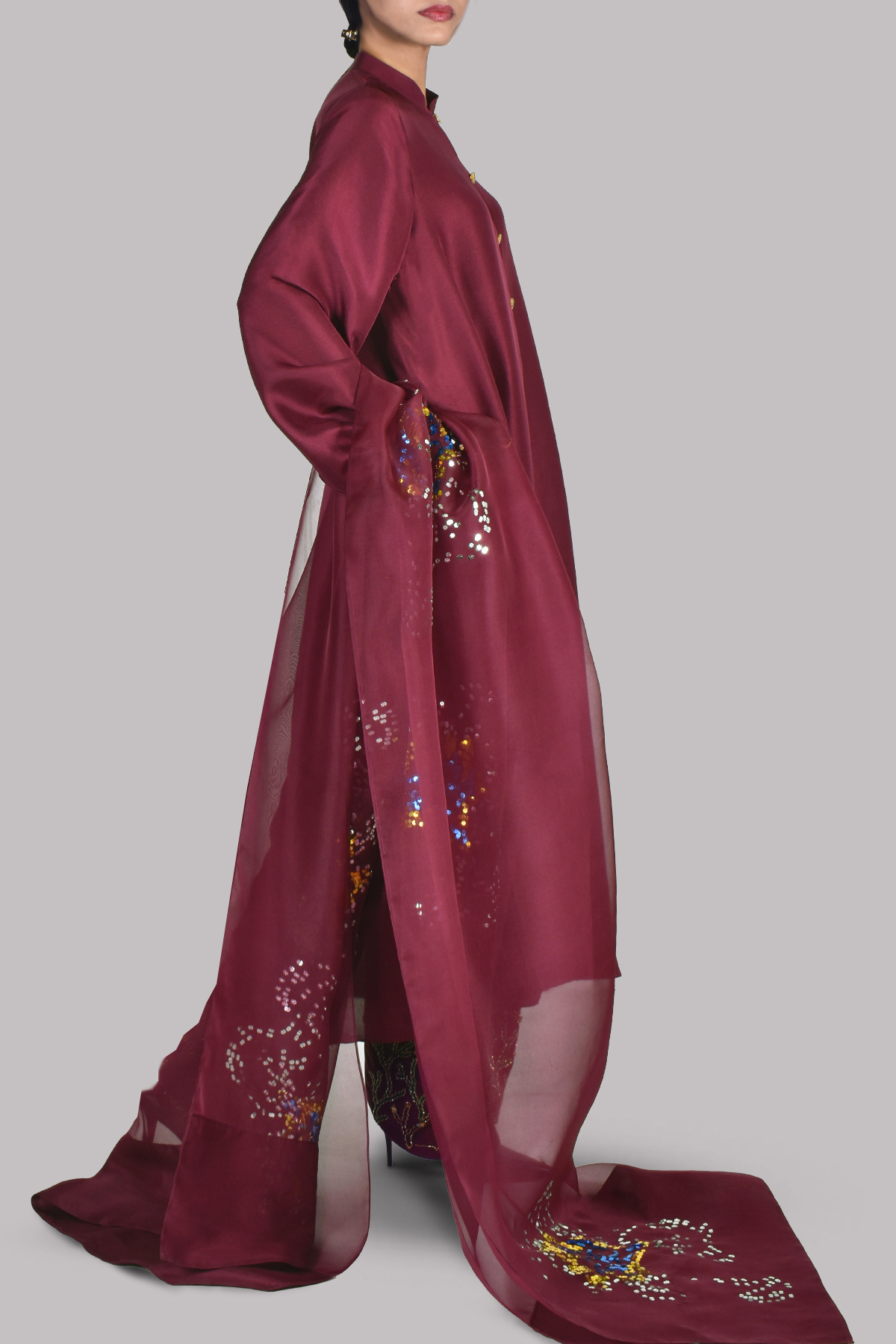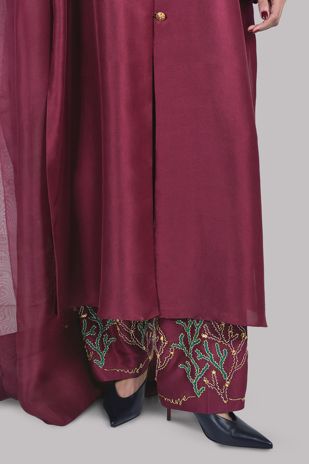 A Cloqué Maroon raw silk buttoned tunic, tailored to perfection with refined detailing, is paired with a matching embellished shalwar that adds subtle opulence. The ensemble is completed with an exquisitely embellished organza dupatta.