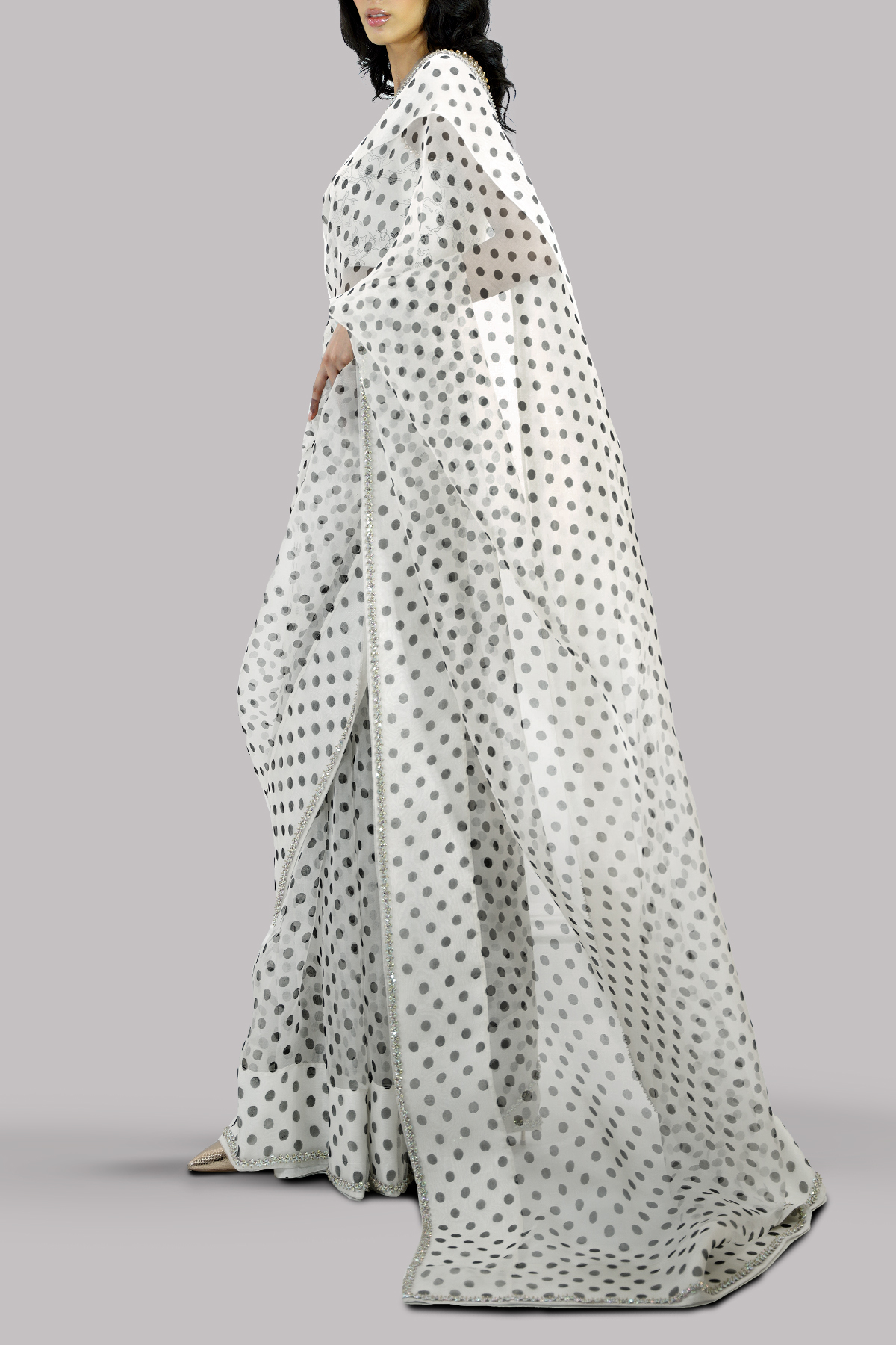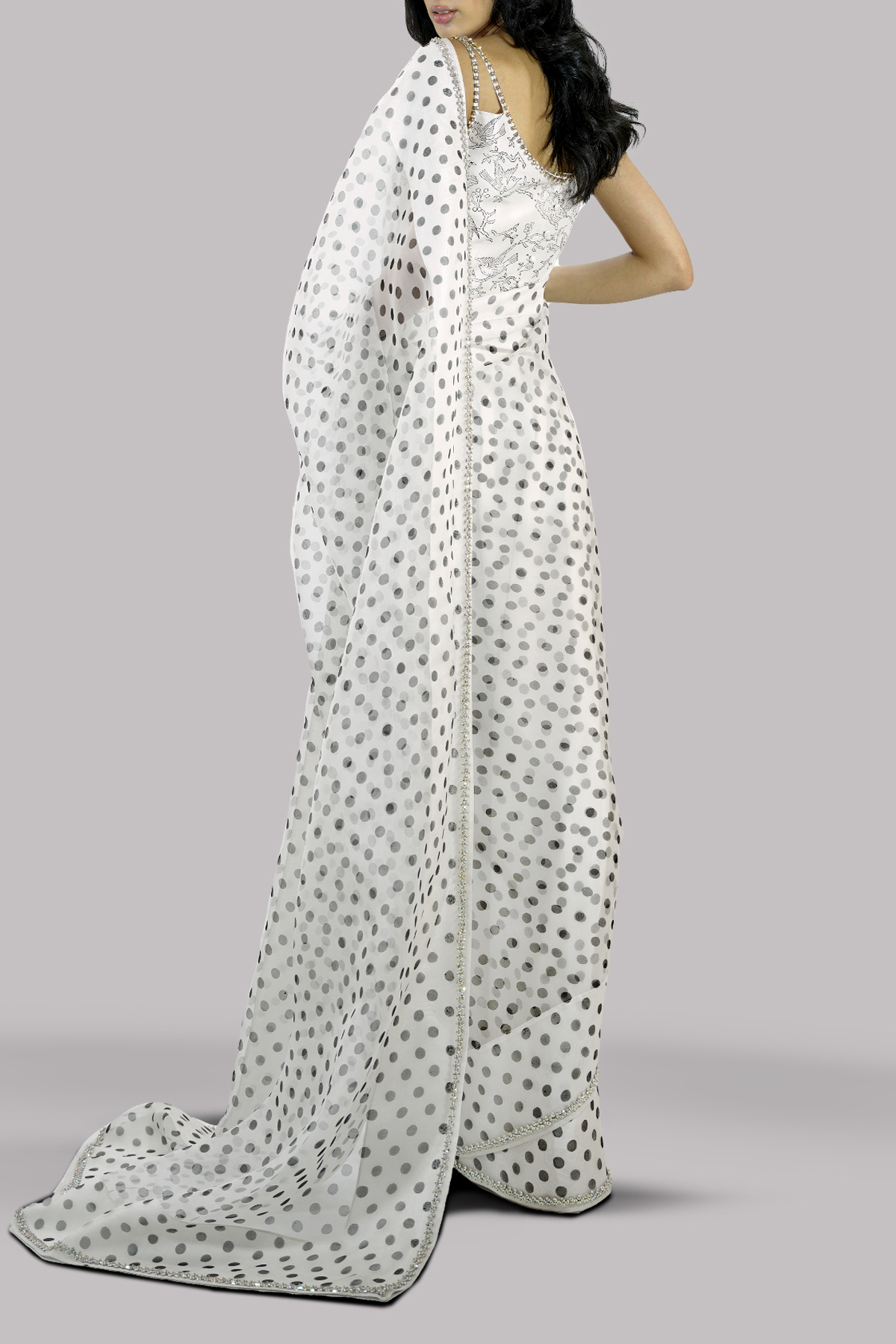 Egret block printed organza sari hand embellished with our intricate embellishments of dazzling crystals and glistening sequins. This is a stylish and perfect three piece look. The sari has stitched pleats for ease of wearing. Matching stitched underskirt included.
