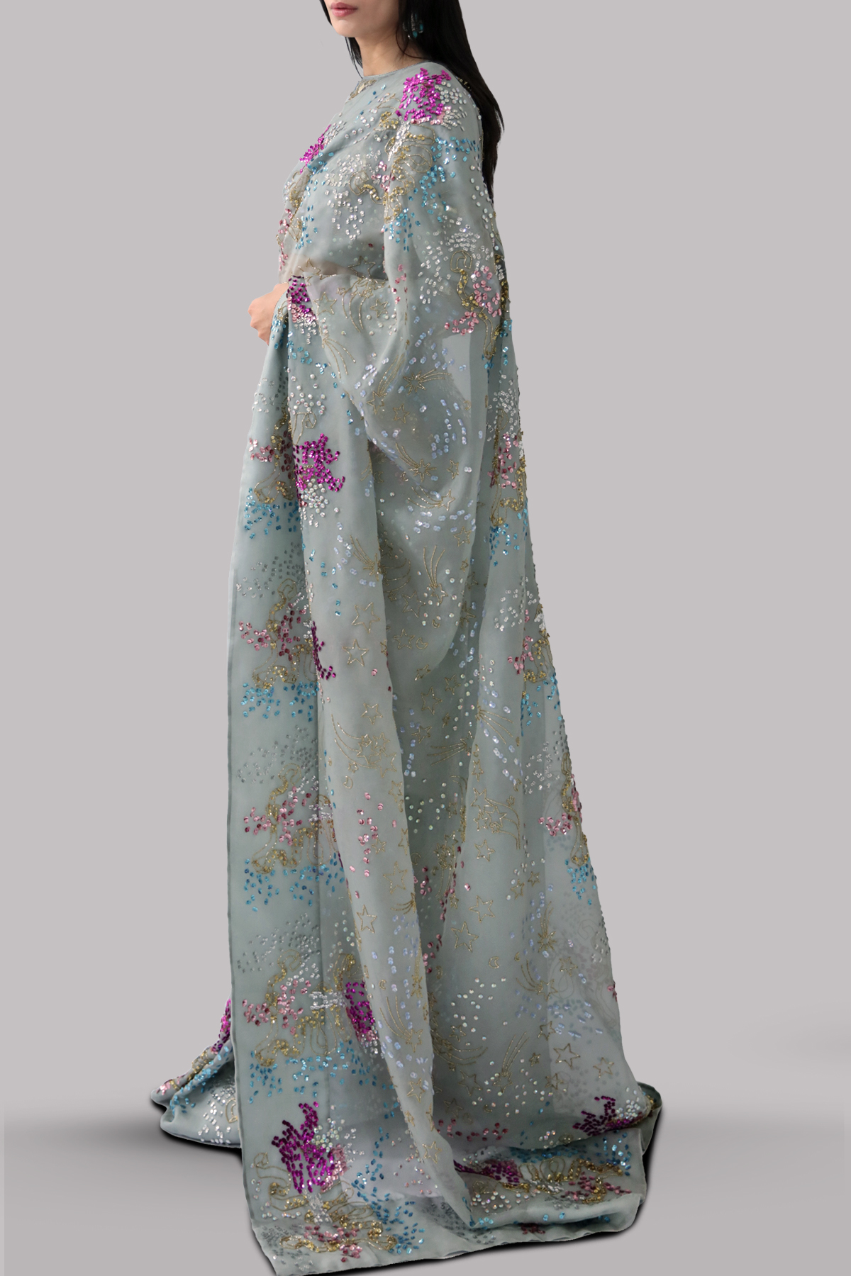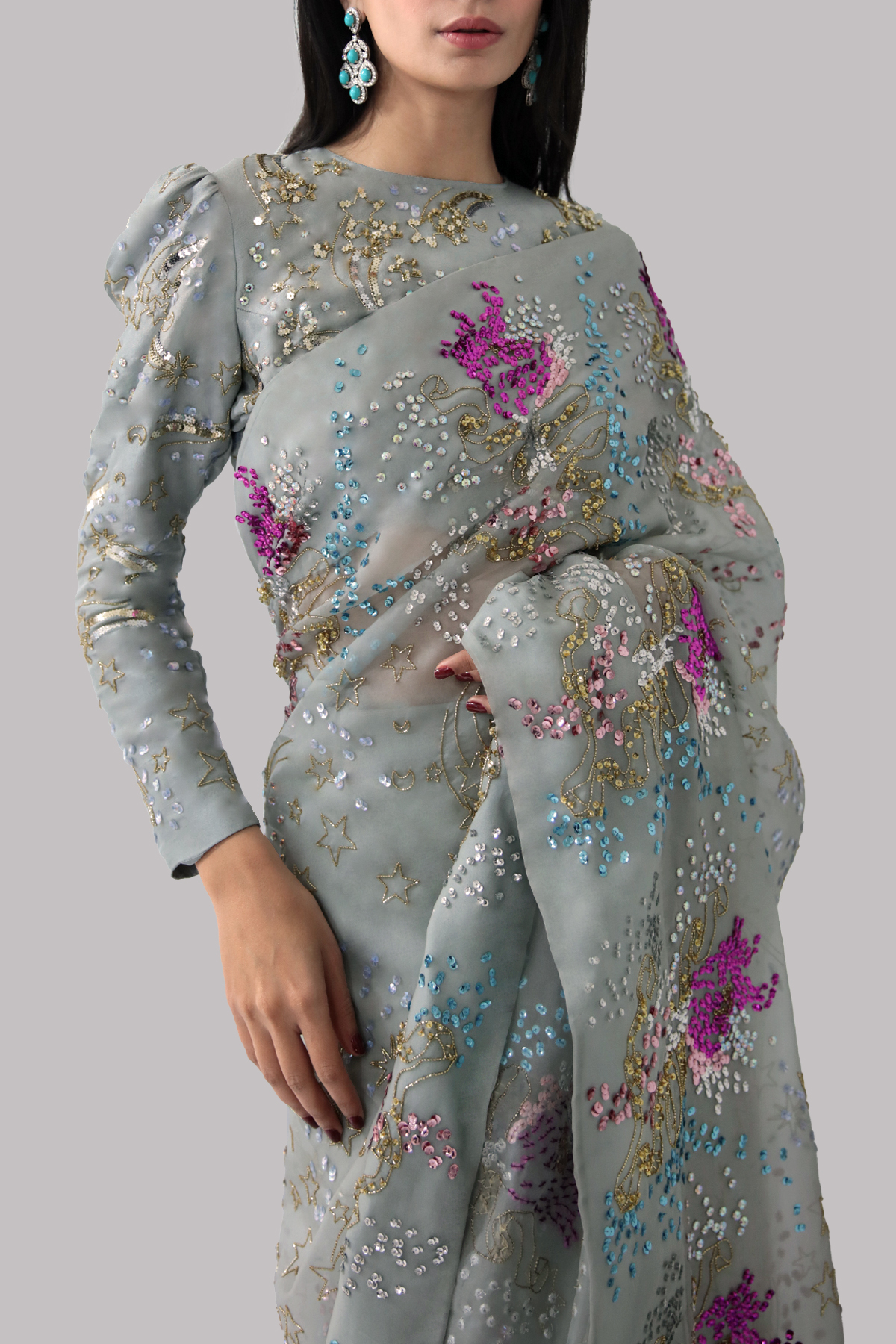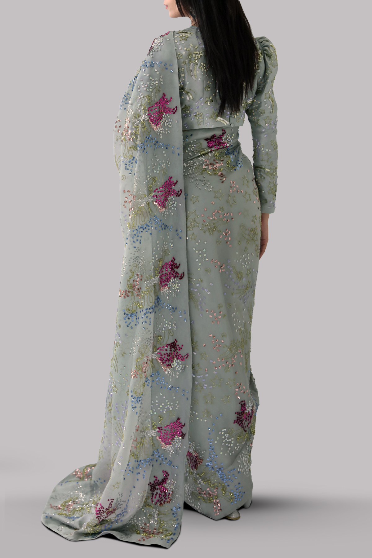 Jadeite organza sari and blouse hand embellished with our intricate embellishments of dazzling crystals and multi coloured glistening sequins. Matching puffed sleeve cropped blouse. This sensational sari is no exception. This is a stylish and perfect three piece look. The sari has stitched pleats for ease of wearing. Matching stitched underskirt included.