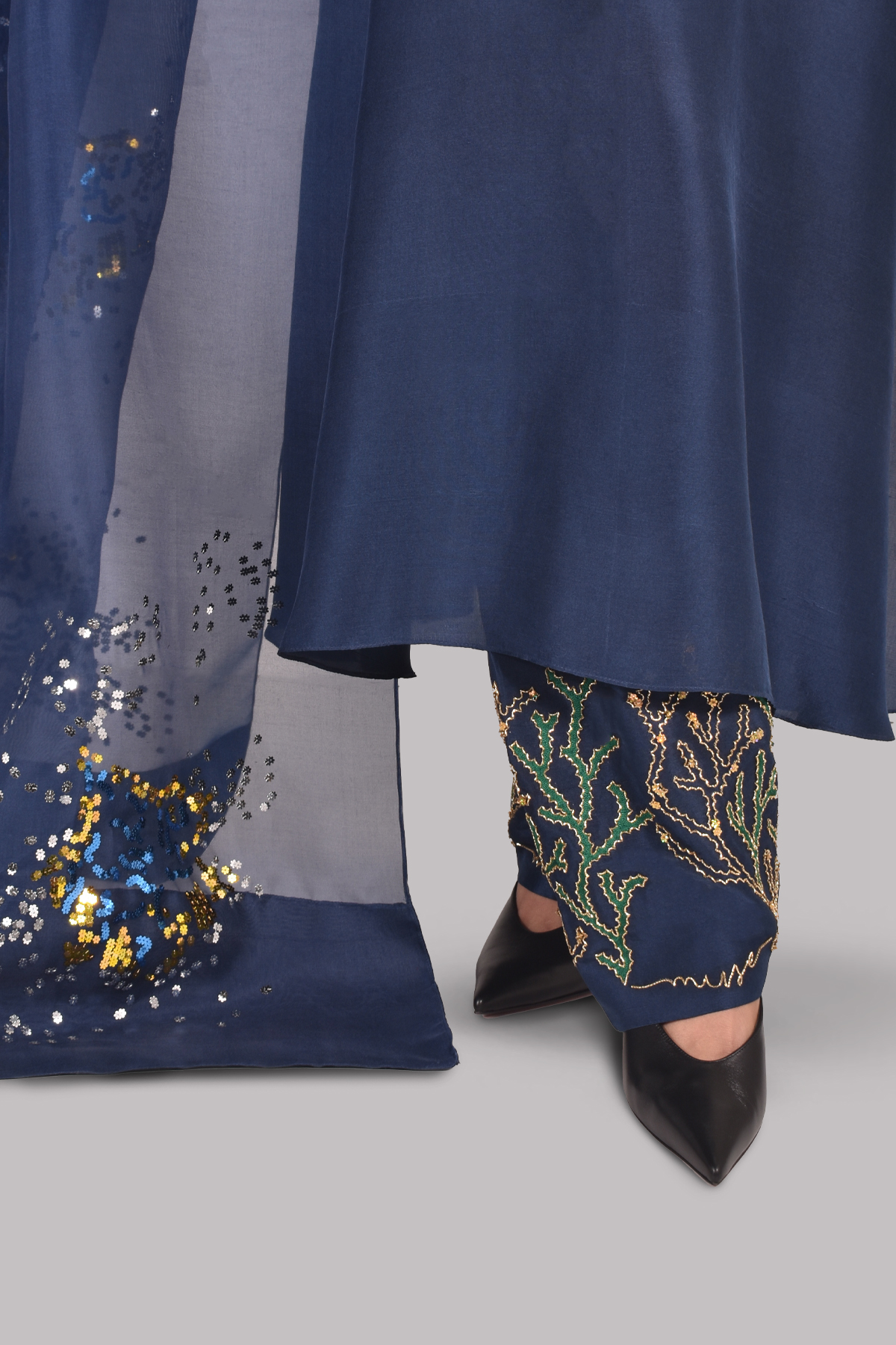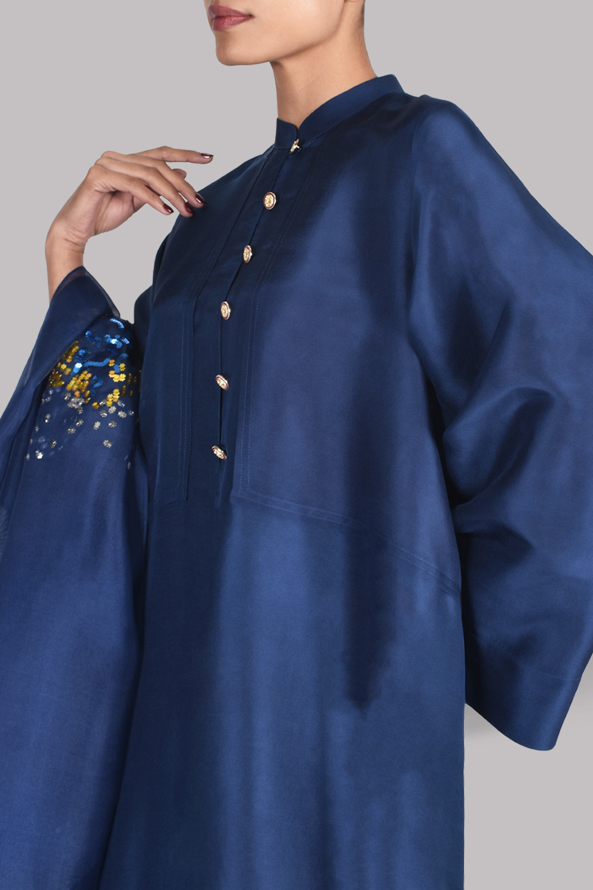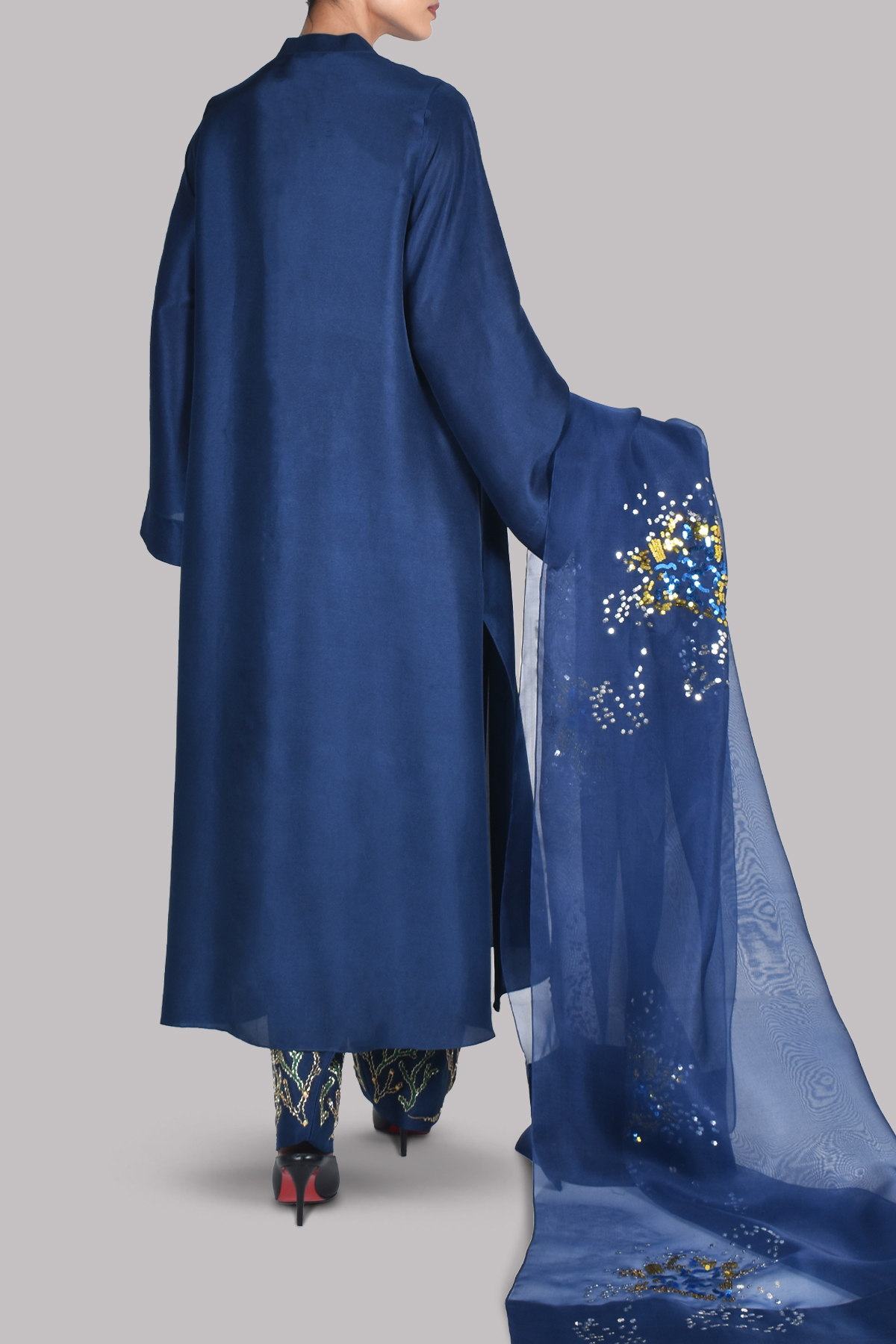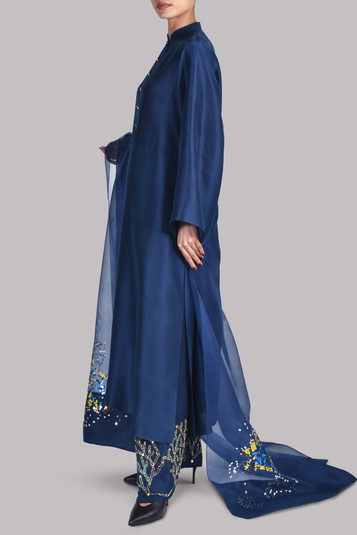 A Pageant Blue raw silk long tunic, beautifully tailored and finished with refined gold French buttons, exudes timeless elegance and modern sophistication. It is paired with a matching embellished shalwar that adds subtle richness and dimension. The ensemble is completed with a delicately embellished organza dupatta.