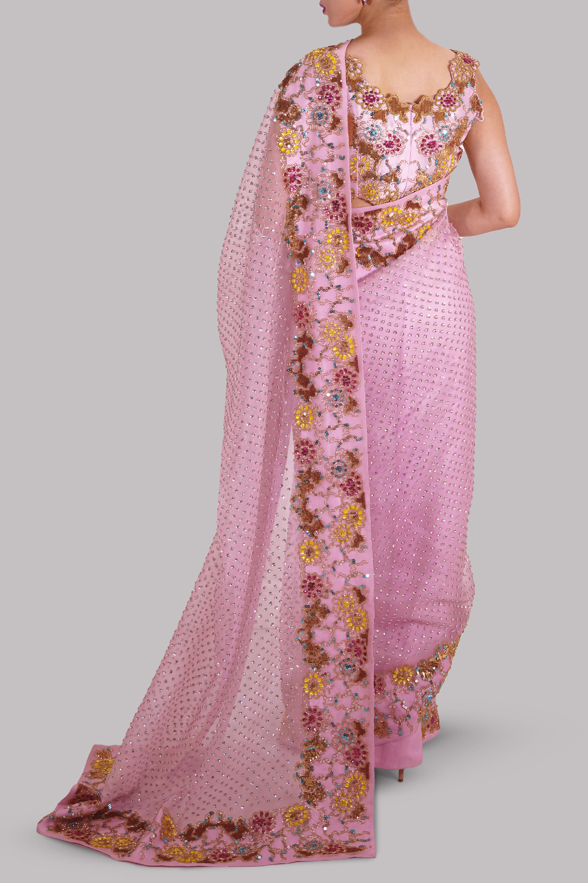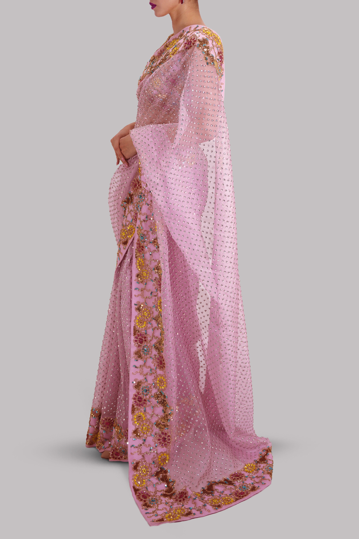 A Pink Pirouette organza sari adorned with delicate embellishment and finished with a beautifully heavy embellished border, paired with an embellished raw silk blouse featuring a cutwork neckline.