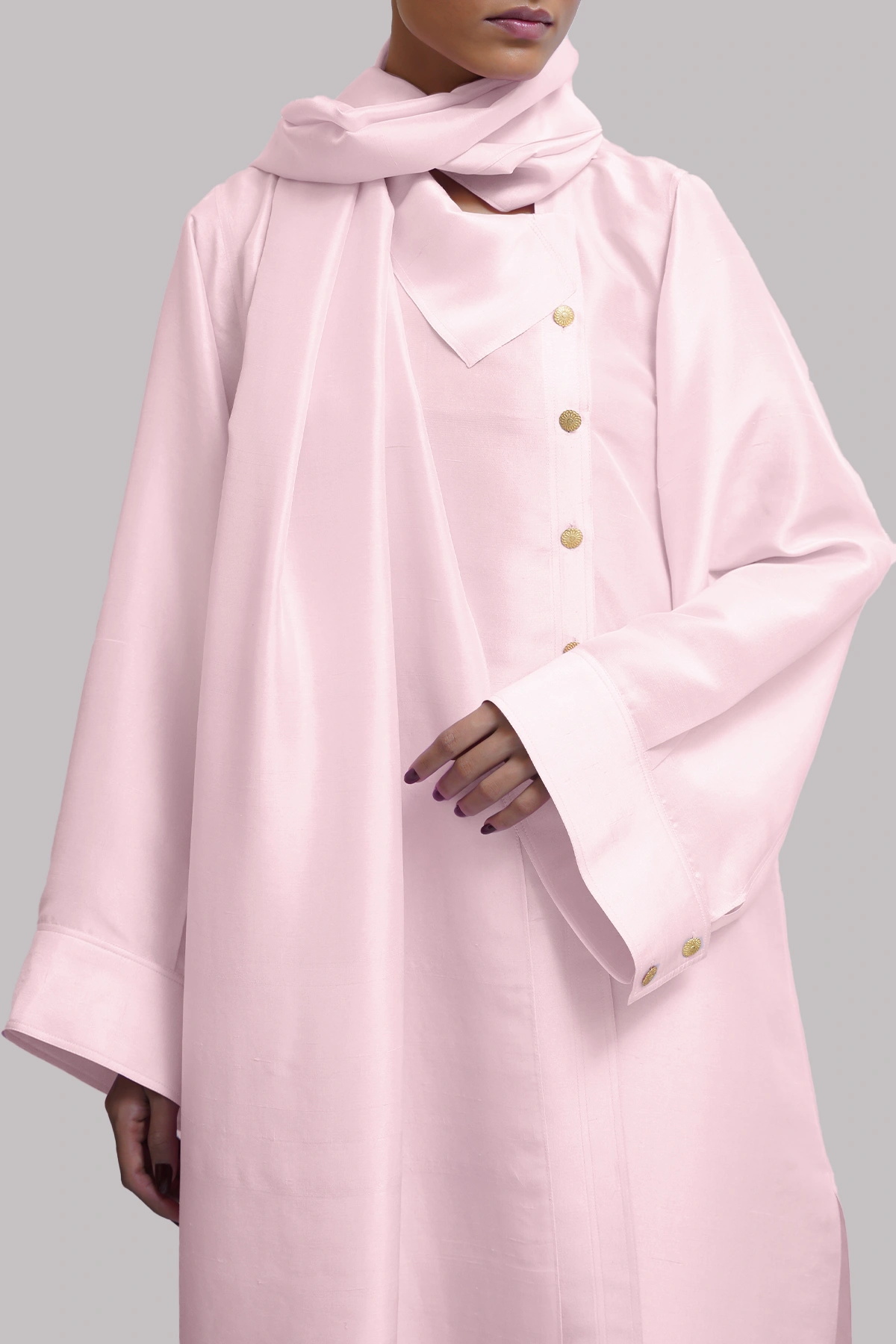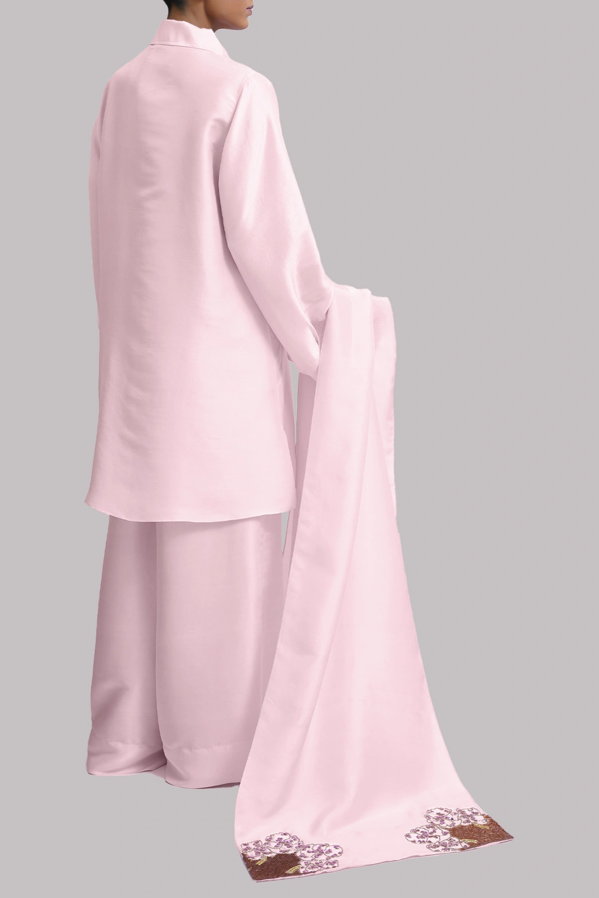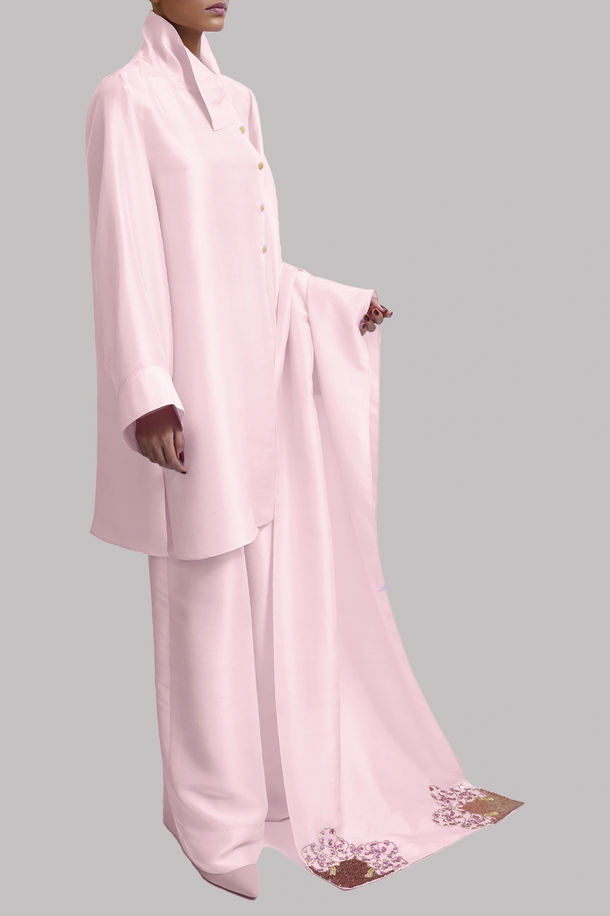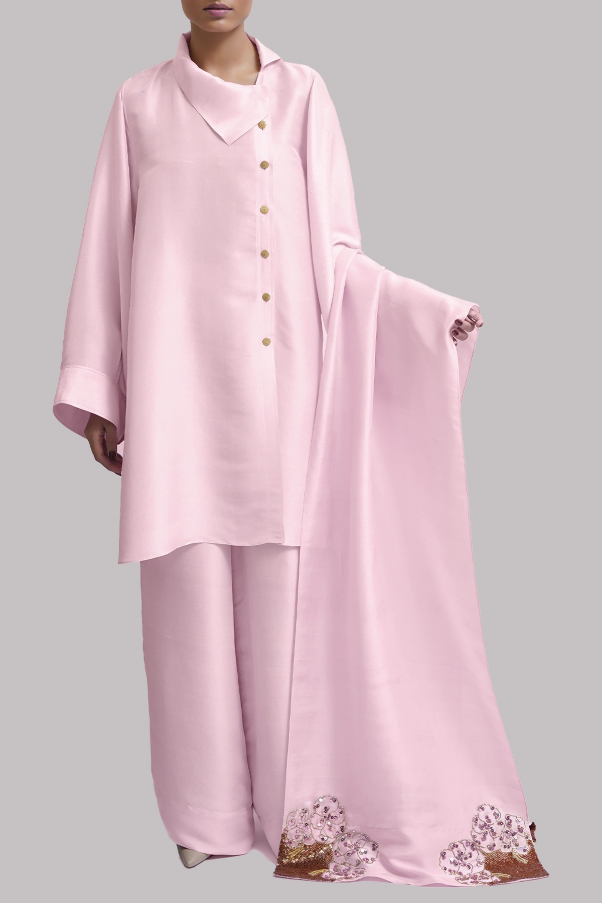 A Pirouette raw silk tunic, beautifully tailored and finished with refined gold French buttons, exudes timeless elegance and modern sophistication. It is paired with a matching embellished wide legged pants that adds subtle richness and dimension. The ensemble is completed with a delicately embellished organza dupatta.