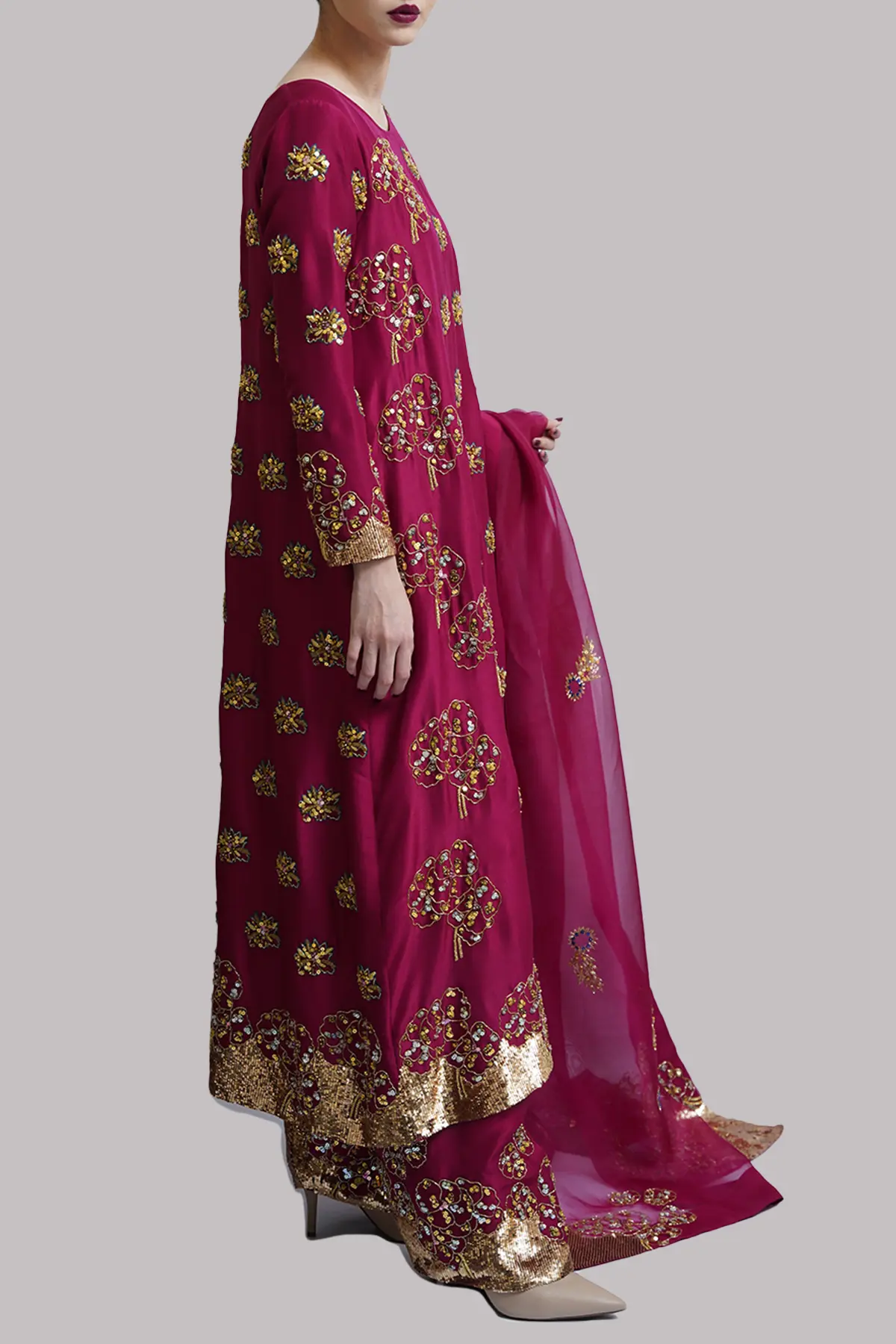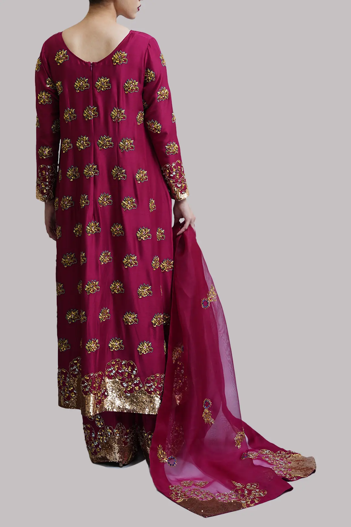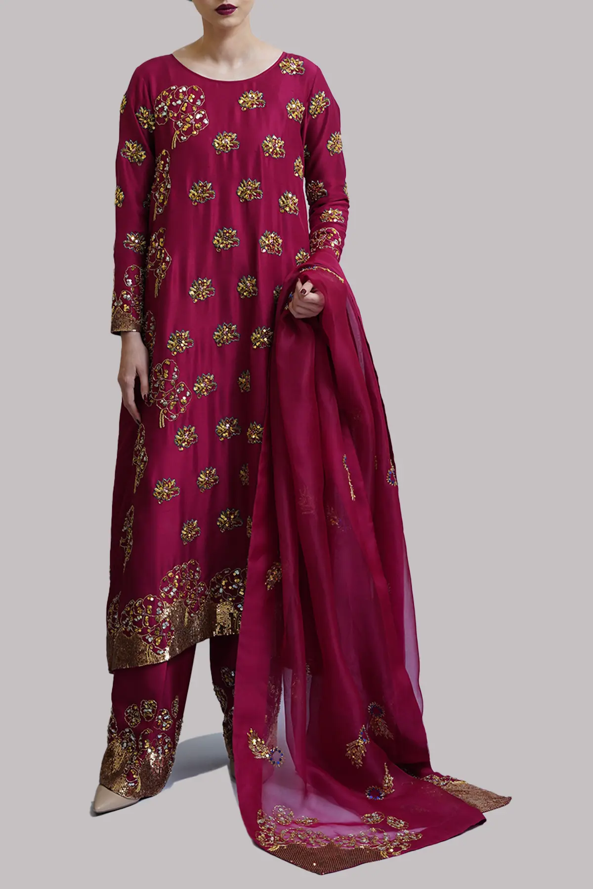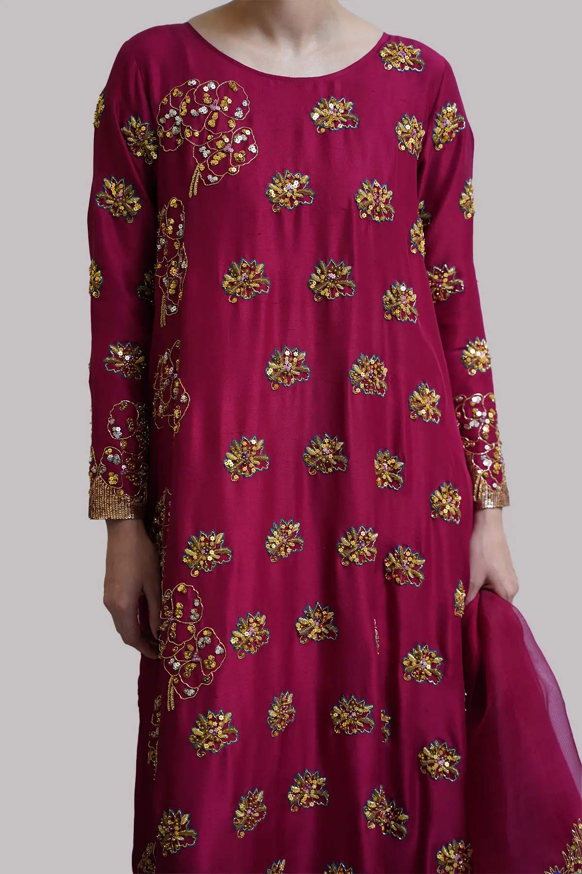 Scooter raw silk tunic adorned with delicate embellishments. Paired with a matching embellished shalwar and a gracefully detailed organza dupatta.