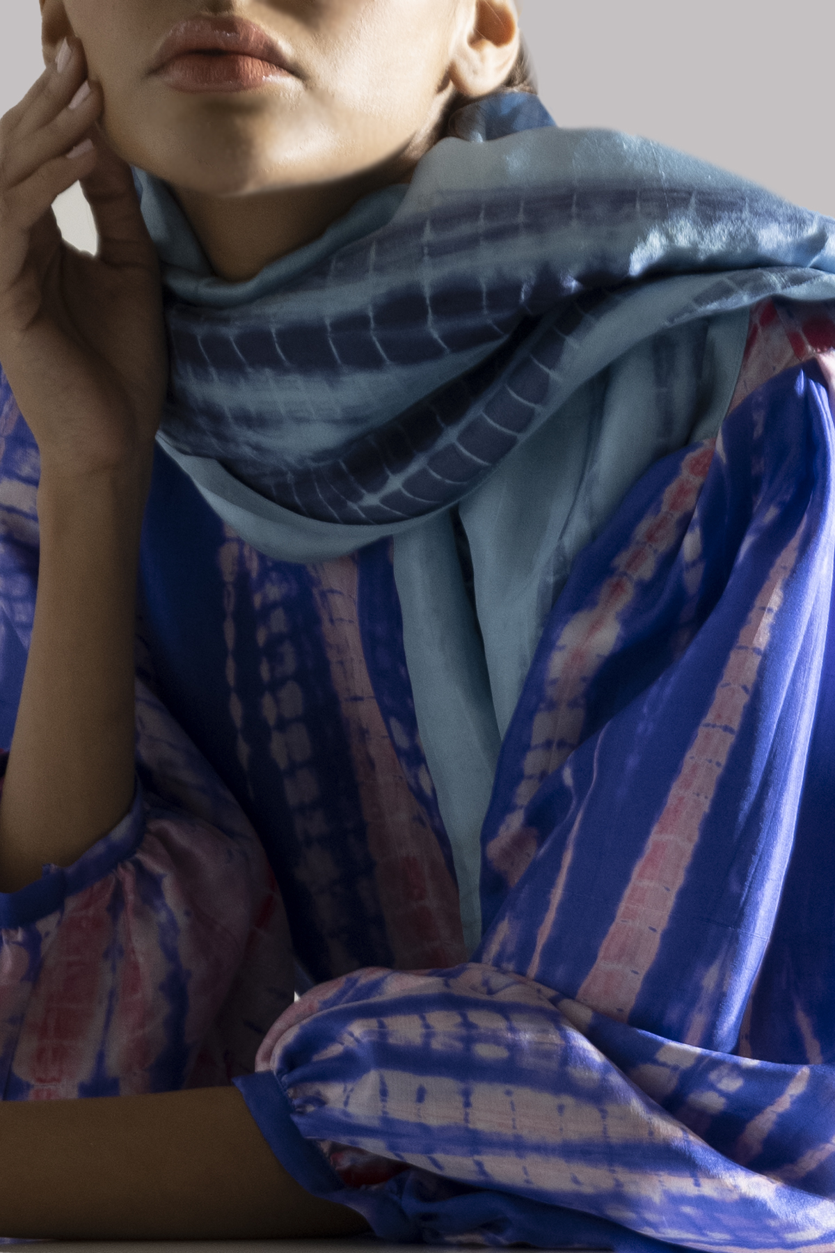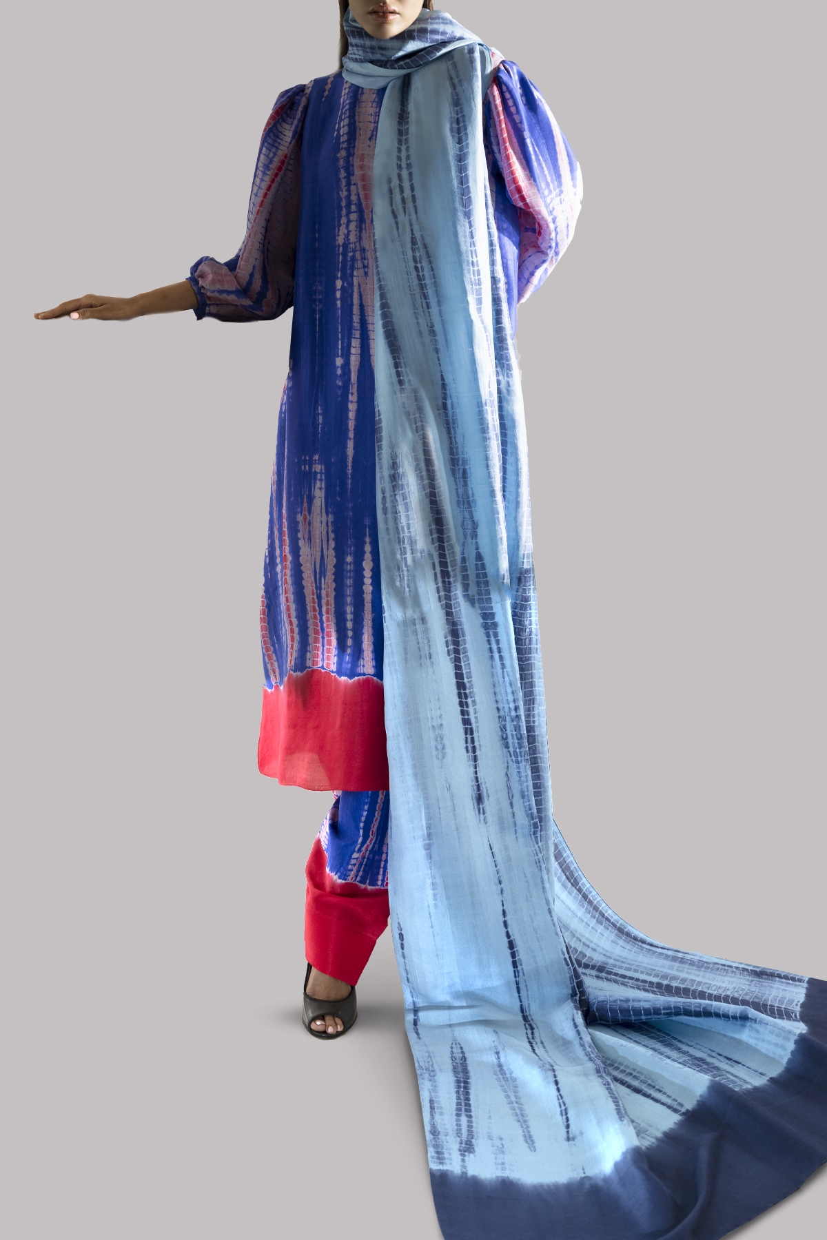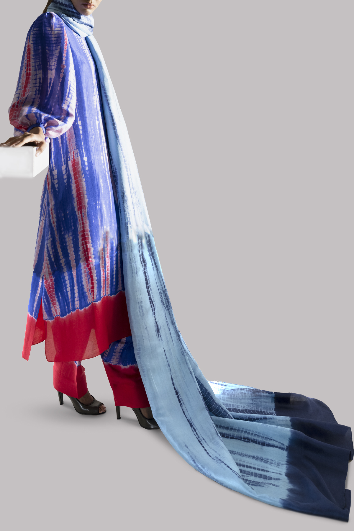 Make a statement in this vibrant tie-dye raw silk set, featuring a long tunic with elegant bell sleeves. The bold blend of Tango Red and Princess Blue adds a striking touch, while the matching shalwar and dupatta complete the look with effortless grace.