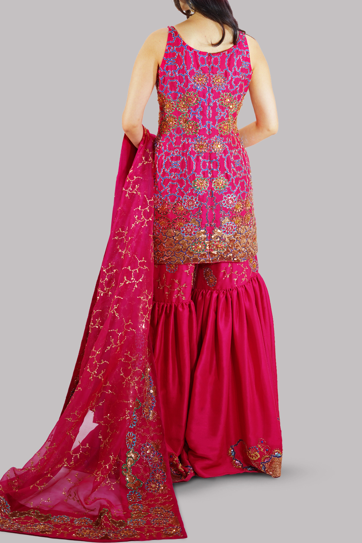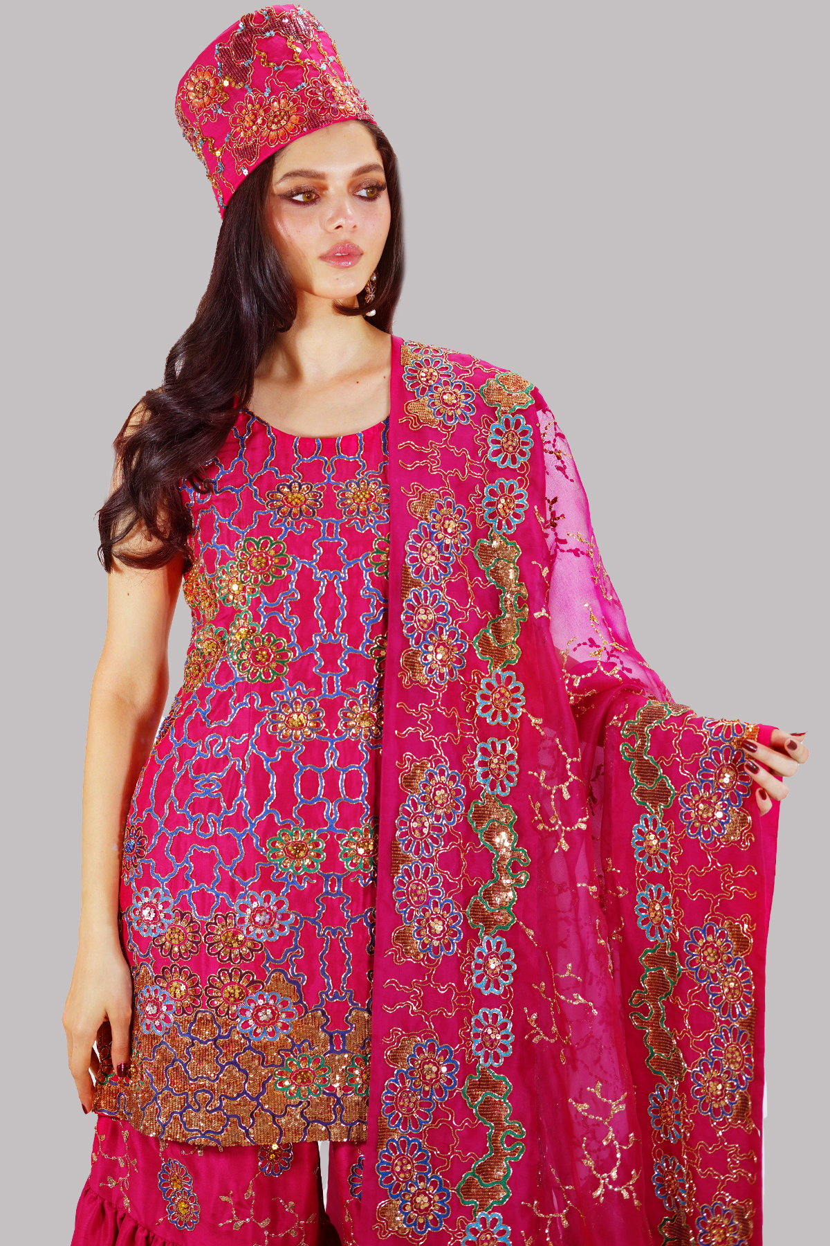 An elegant virtual pink tunic adorned with delicate hand embellishments, paired with a lightly embellished gharara for graceful movement. Finished with a refined embellished dupatta, this ensemble embodies effortless glamour.