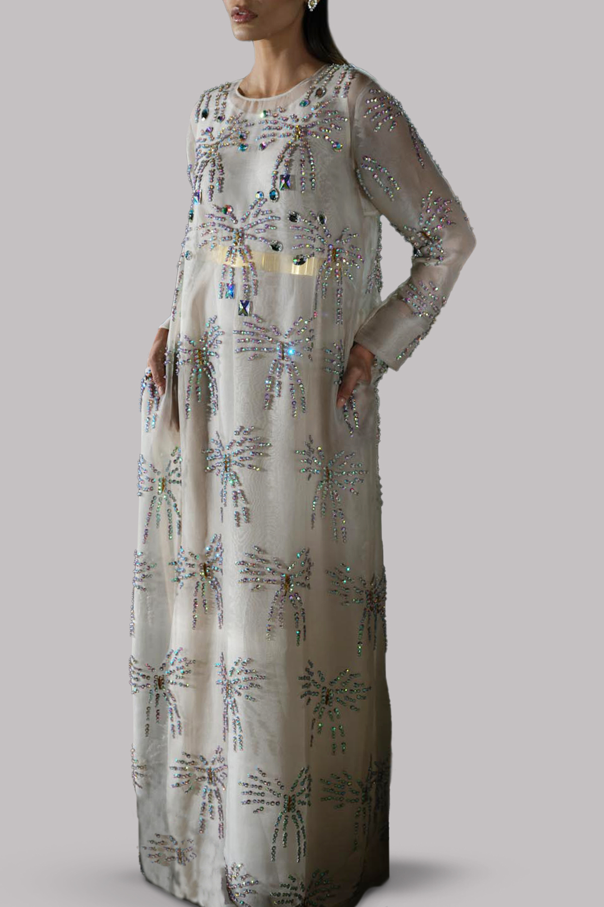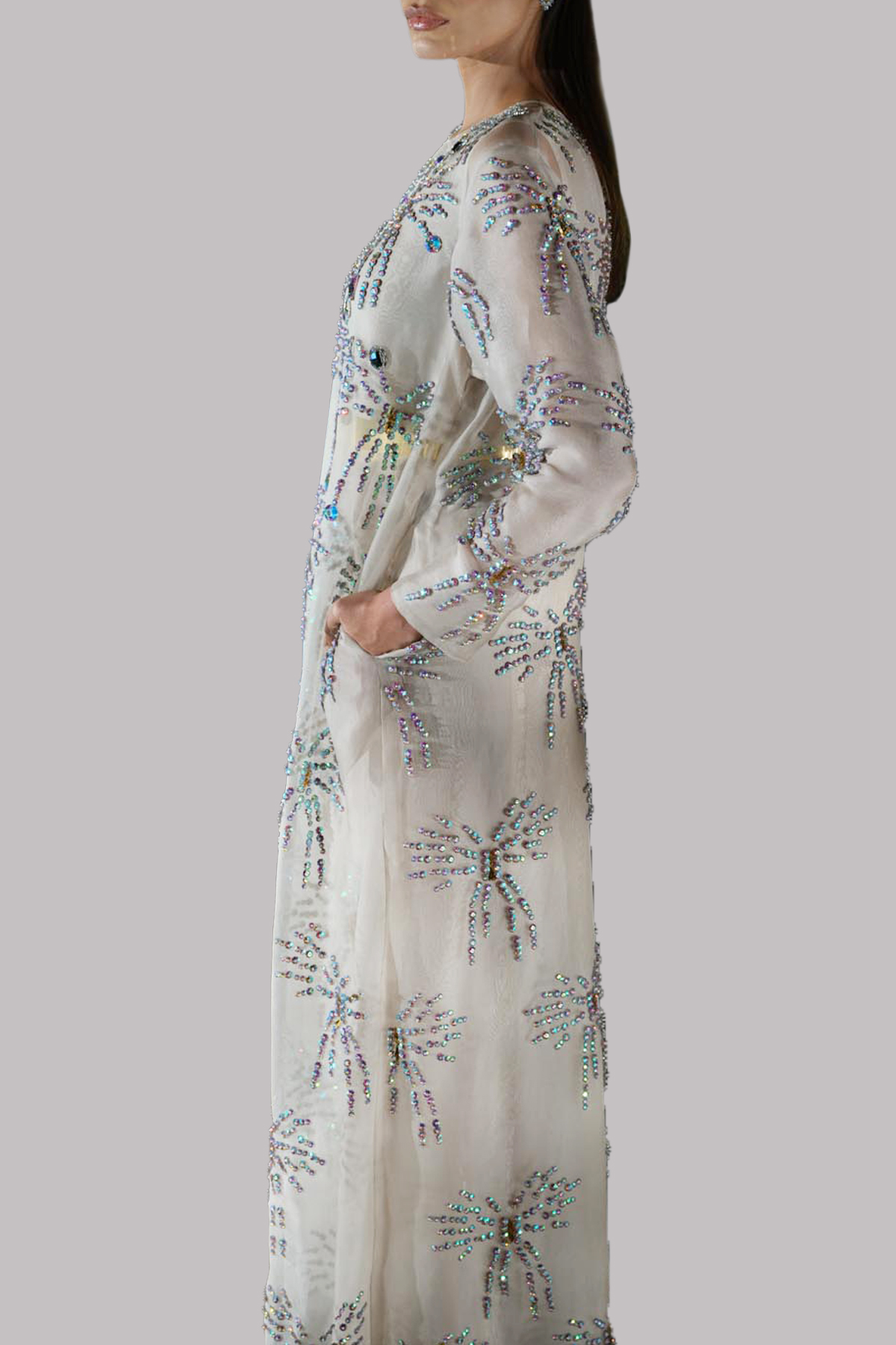 The White Swan organza maxi exudes charm and sophistication with its delicate multicolour embellishments arranged in elegant bow motifs. Crafted from sheer, airy organza, the silhouette flows gracefully, reflecting refined craftsmanship and modern femininity.